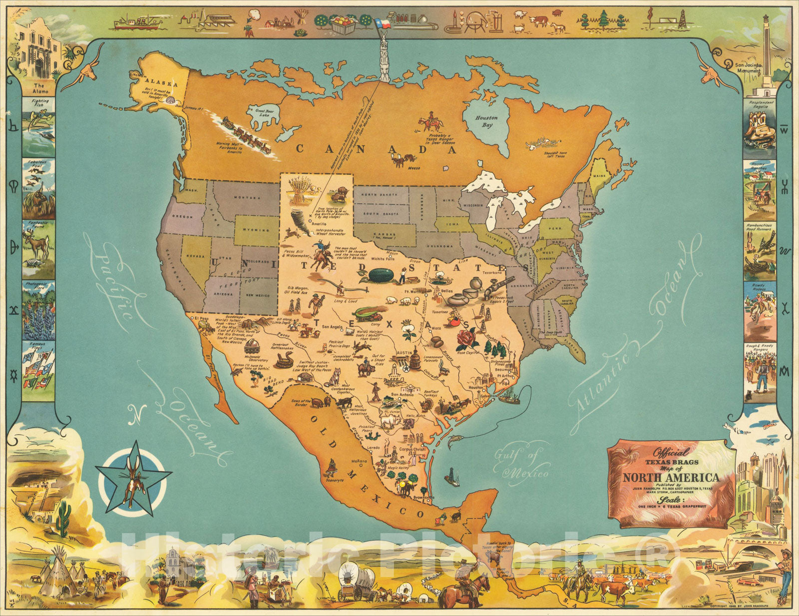 • .Historic Map : Official Texas Brags Map of North America, Scale One Inch = 6 Texas Grapefruit, 1948, Mark Storm, v1, Vintage Wall Art