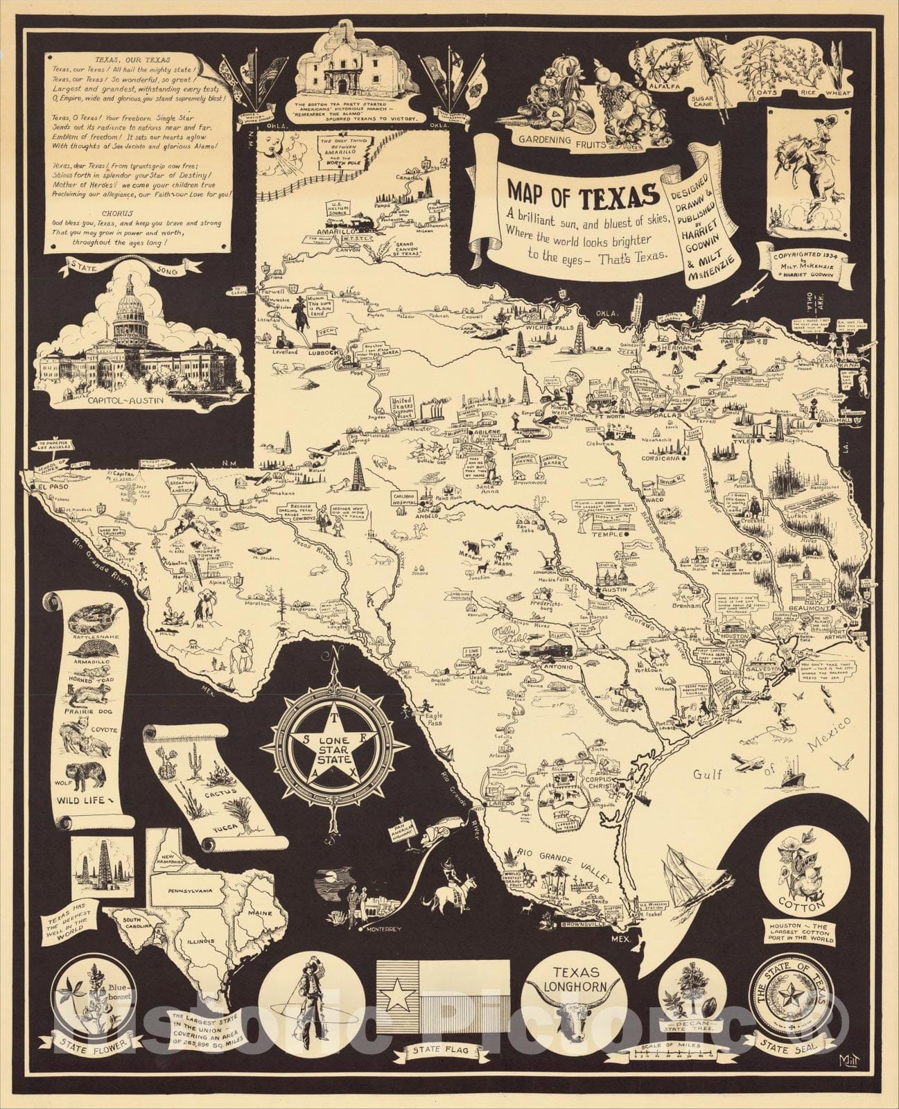 Historic Map : Map of Texas A brilliant sun, and bluest skies, Where the world looks brighter to the eyes -- That's Texas., 1934, Harriet Godwin, Vintage Wall Art