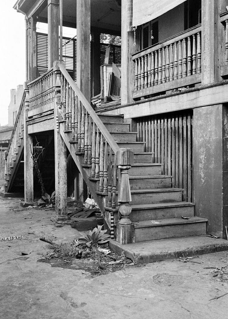 4. Historic American Buildings Survey E. W. Russell, Photographer, November 12, 1936 STAIRWAY TO PORCH ON SOUTH ELEVATION OF LODGE - Waring House, Texas, 110 South Claiborne Street, Mobile, Mobile County, AL