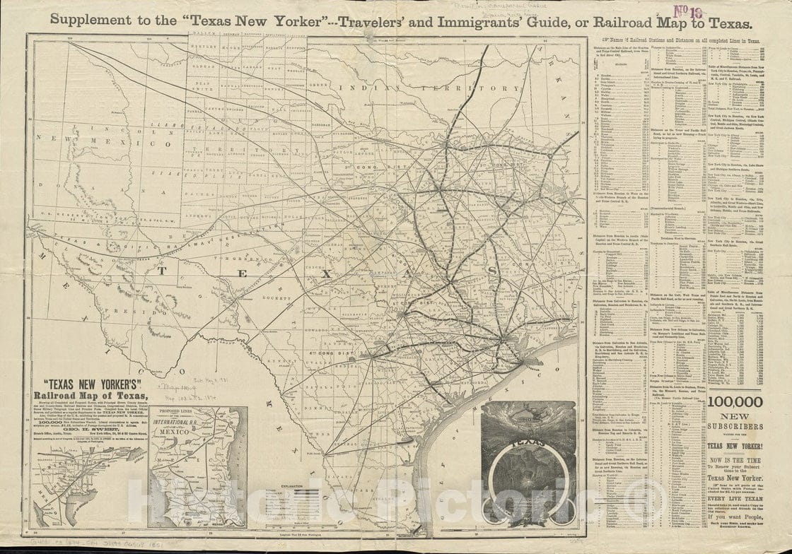 Texas New Yorker's railroad map of Texas : showing all completed and proposed routes, with principal rivers, county boundaries and county-seats, railroad stations and distances, congressional districts, United States military telegraph line, and frontier posts