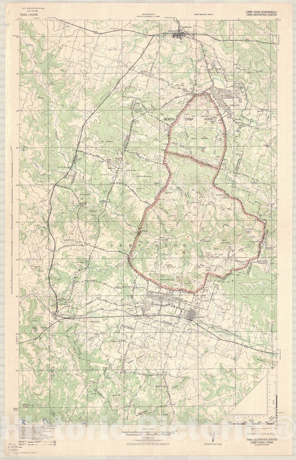 Map : Fort Hood, Texas 1946, Camp Hood quadrangle tank destroyer center , Antique Vintage Reproduction