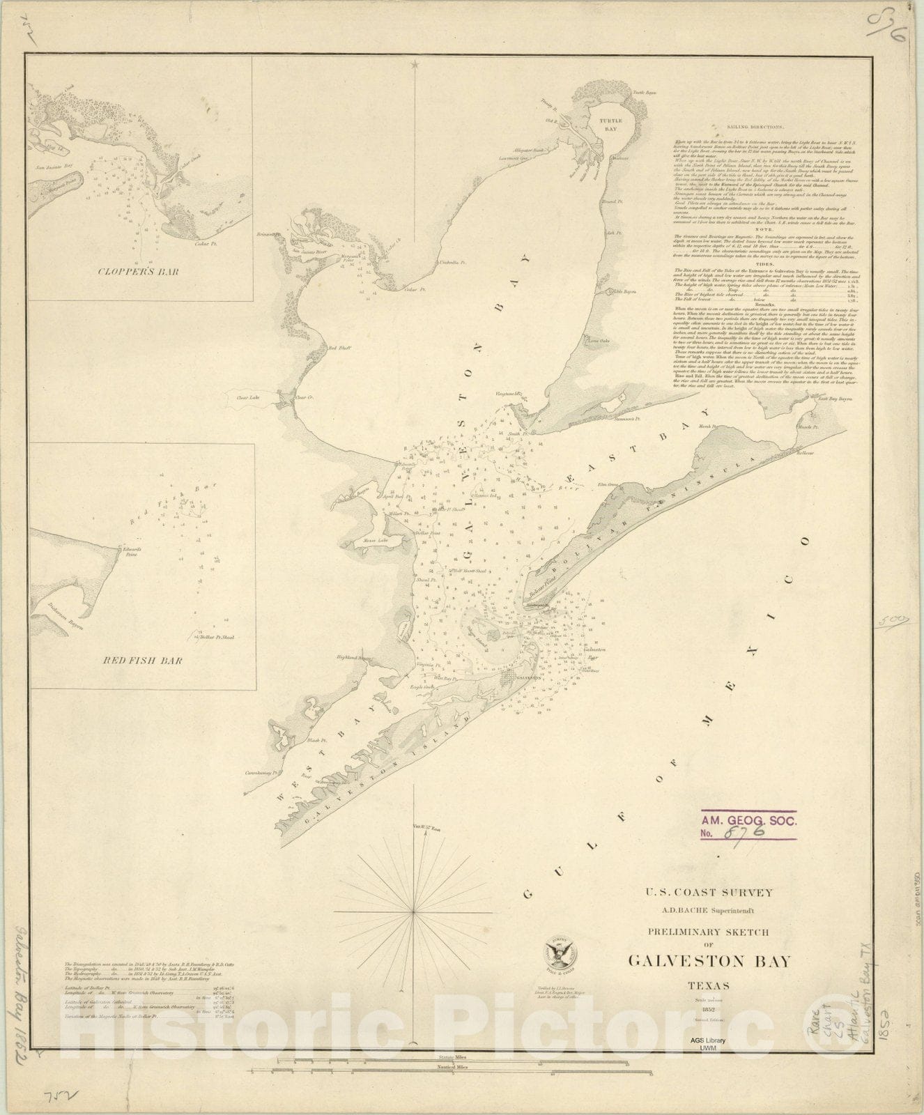 Map : Galveston Bay, Texas 1852, Preliminary sketch of Galveston Bay, Texas , Antique Vintage Reproduction