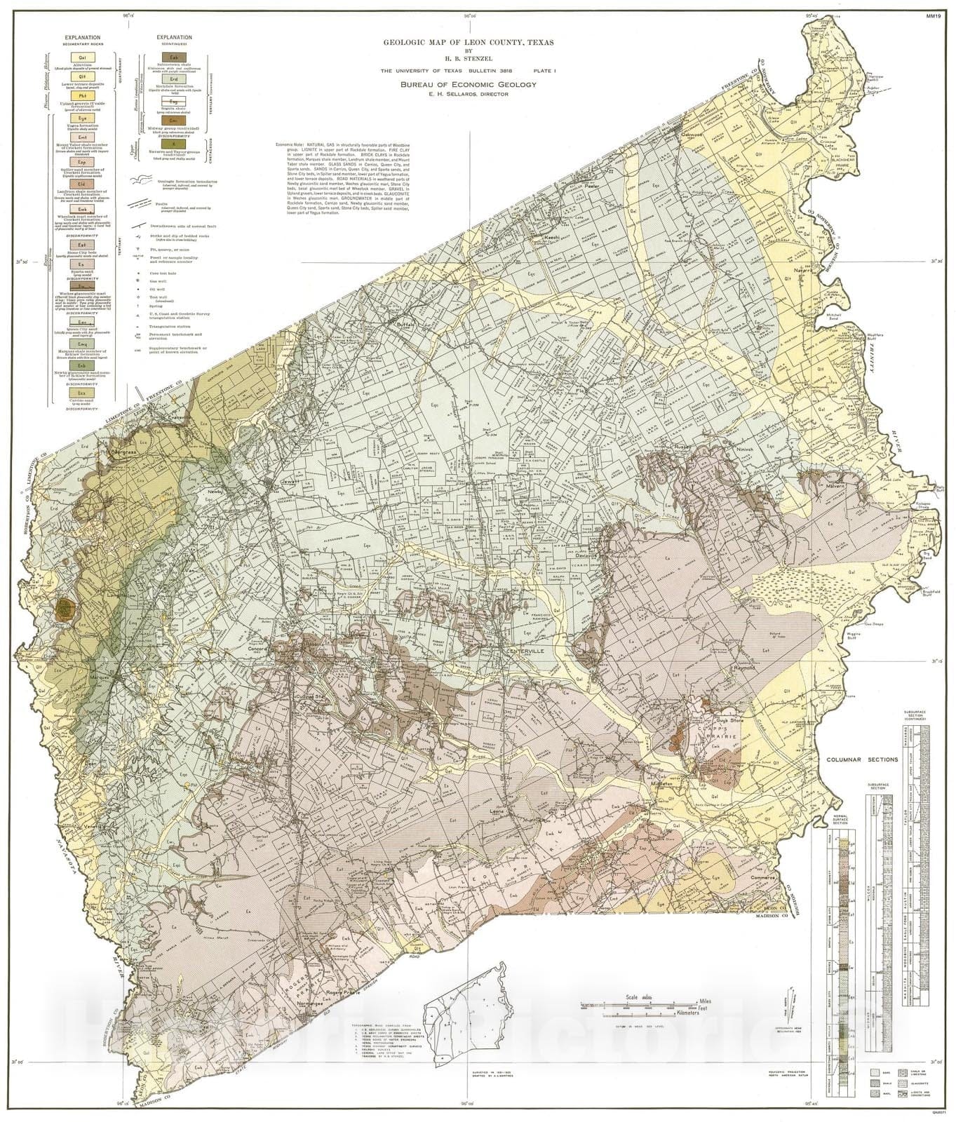 Map : Geologic Map of Leon County, Texas, 1938 Cartography Wall Art :