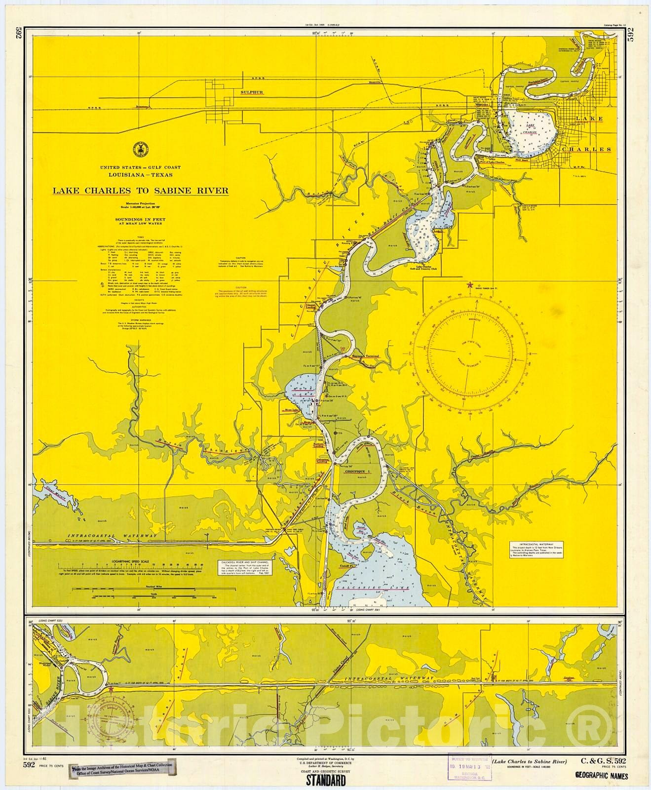 Historic Nautical Map - Lake Charles To Sabine River, 1961 NOAA Chart - Texas (TX) - Vintage Wall Art
