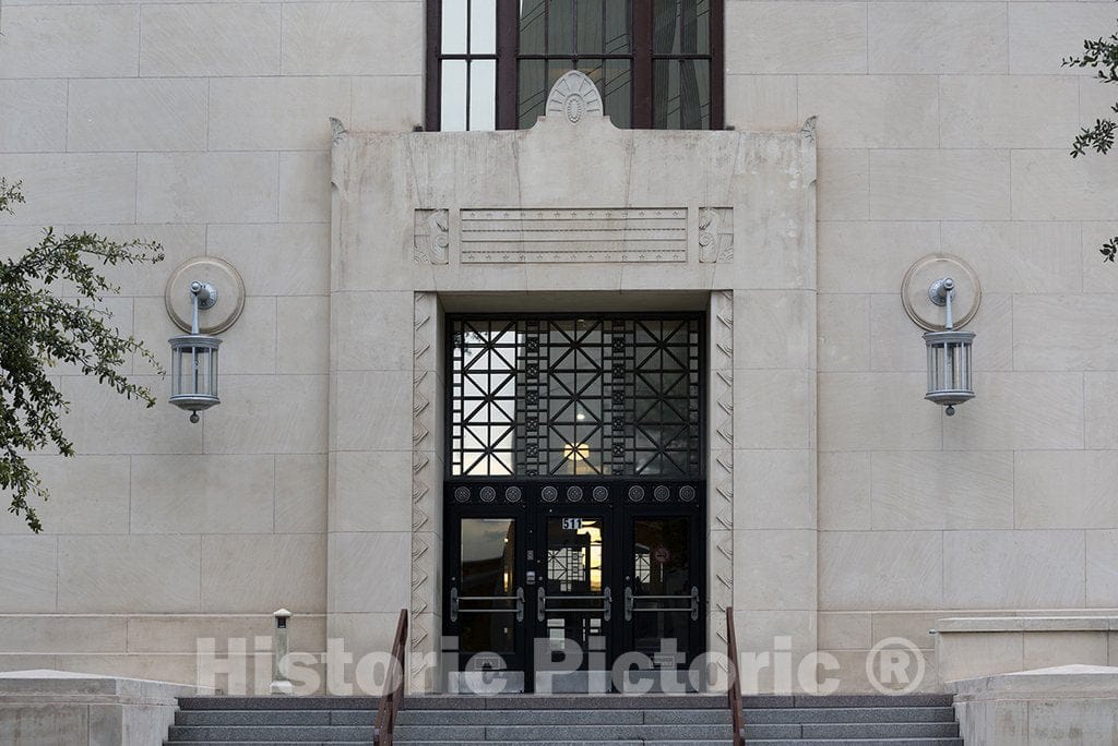 U.S. Courthouse built in 1936 by architect McGhee Fraser Lippencott. Neoclassical, Art Deco. Front entrance.