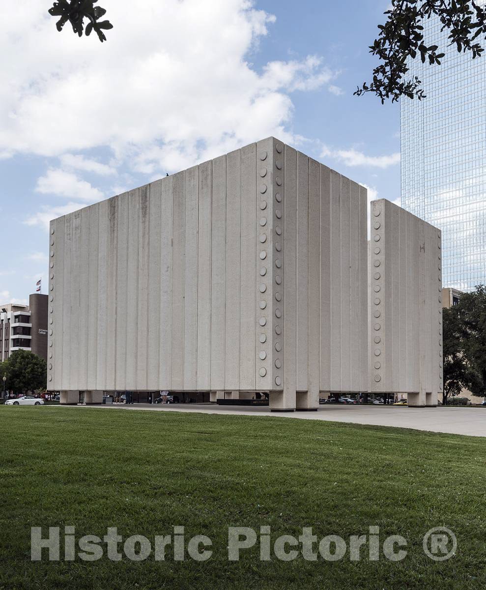 Designed by architect Philip Johnson and erected in 1970, the concrete memorial to President Kennedy dominates a square in downtown Dallas near Dealey Plaza, where the president was assassinated. Johnson's design is a cenotaph, or open tomb, that symbolizes the freedom of Kennedy's spirit. The memorial is a square, roofless room, 30 feet high and 50 x 50 feet wide with two narrow openings facing north and south. | Credit line: The Lyda Hill Texas Collection of Photographs in Carol M. Highsmith's America Project, Library of Congress, Prints and Photographs Division.|Gift; The Lyda Hill Foundation; 2014; (DLC/PP-2014:054).|Forms part of: Lyda Hill Texas Collection of Photographs in Carol M. Highsmith's America Project in the Carol M. Highsmith Archive.