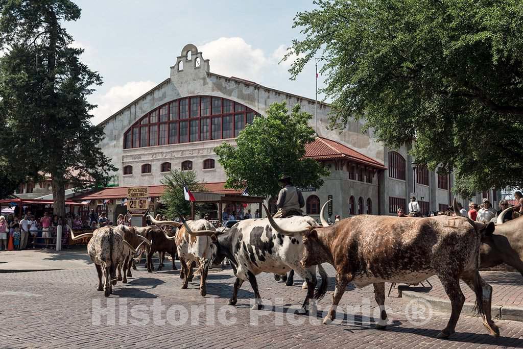 Photo - One of The Twice-Daily parades of Longhorn Steers (for Tourists' Enjoyment) up Exchange Street in The Stockyards District of Fort Worth, Texas - Fine Art Photo Reproduction