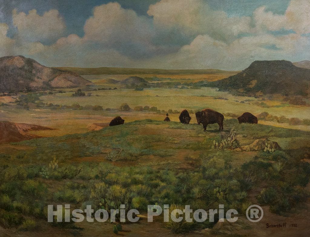 • Photo- an Untitled 1932 Oil Painting by George Sanderson Bickerstaff, displayed at The Buffalo Gap Historic Village in The unincorporated Taylor County, Texas, Town of The Same Name