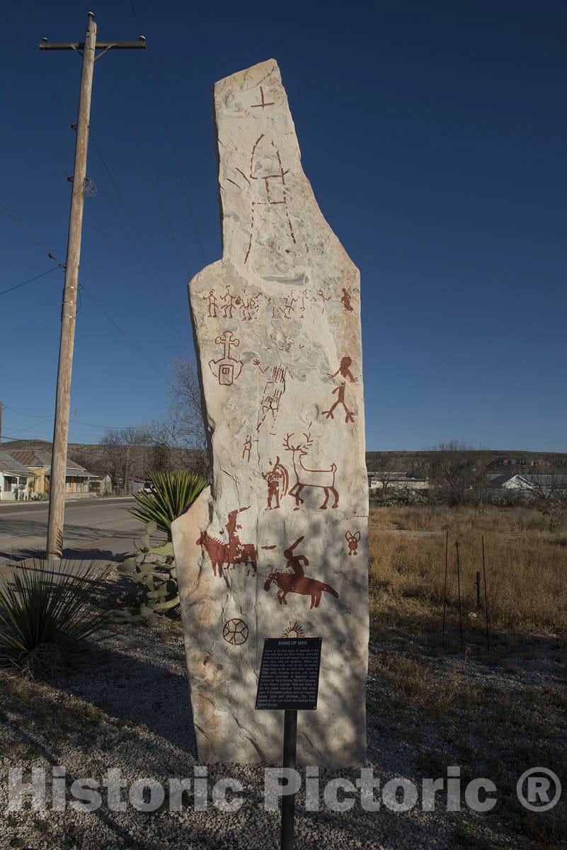 Photograph- An artistic rock carving that highlights the many pictographs by native peoples found among the rocks in surrounding Terrell County, in the"Trans-Pecos" region of southwest Texas