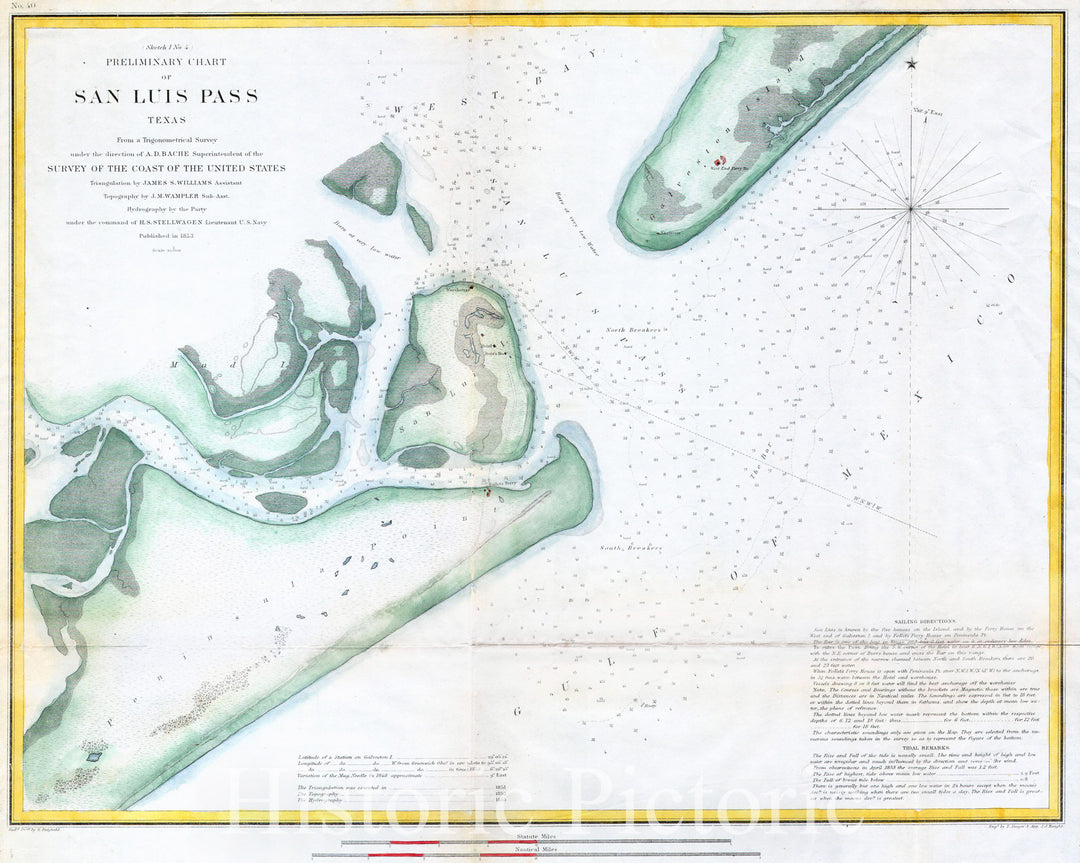 Historic Map : U.S.C.S. Coast Chart or Map of San Luis Pass, Texas , 1853, Vintage Wall Art