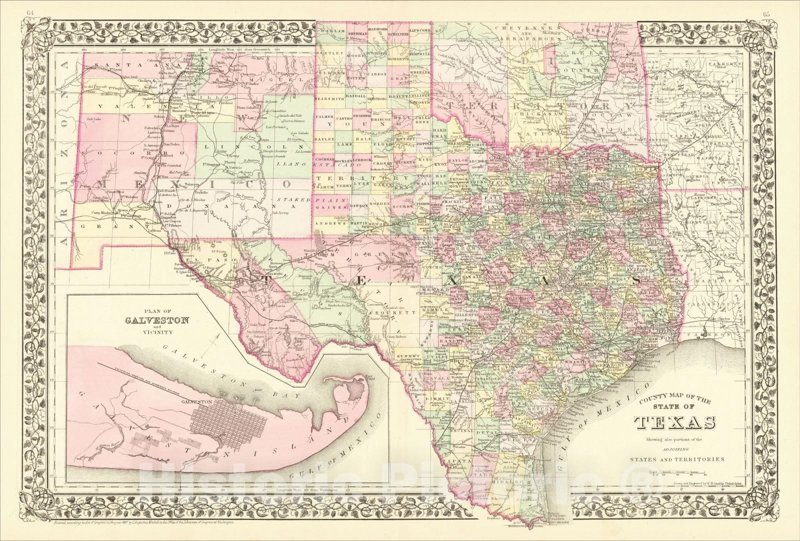 Historic Map : County Map of The State of Texas Showing also portions of the Adjoining States and Territories, 1881, Samuel Augustus Mitchell Jr., Vintage Wall Art