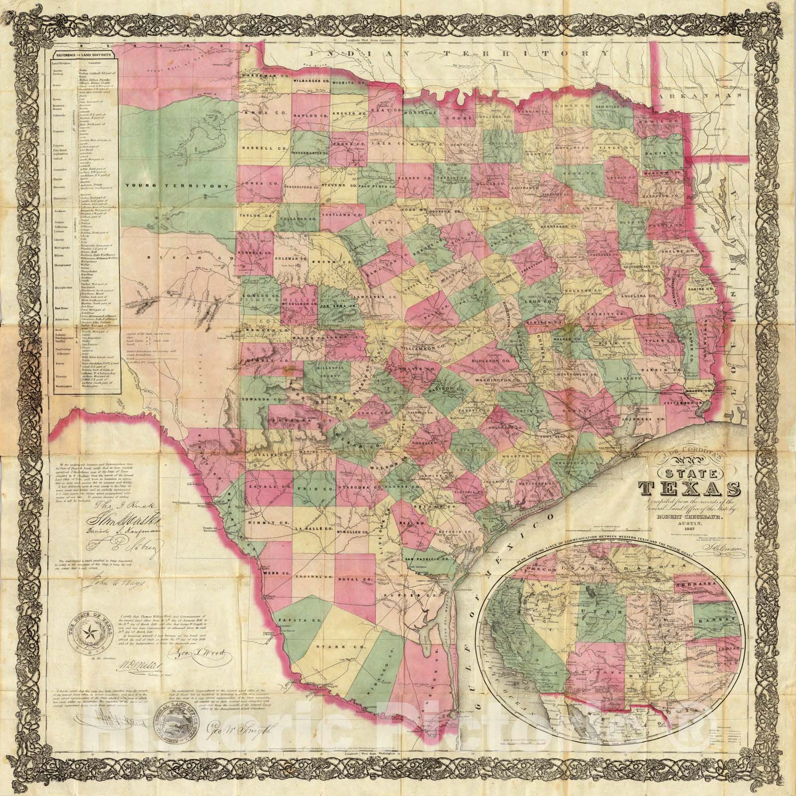 Historic Map - J. de Cordova's Map of the State of Texas, 1867, Jacob De Cordova - Vintage Wall Art