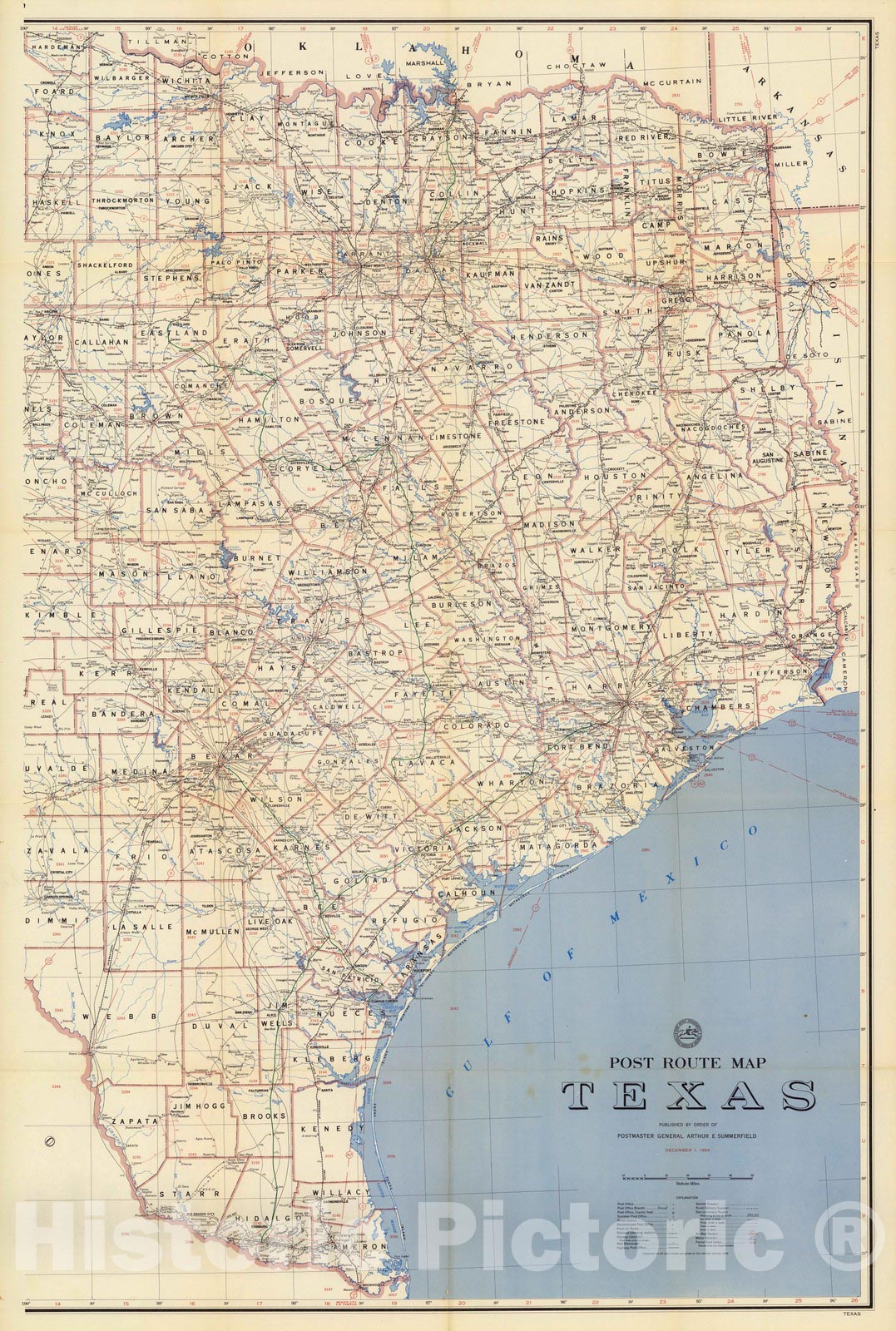 Historic Map : Post Route Map of the State of Texas December 1, 1954. (Eastern Division.) - Vintage Wall Art