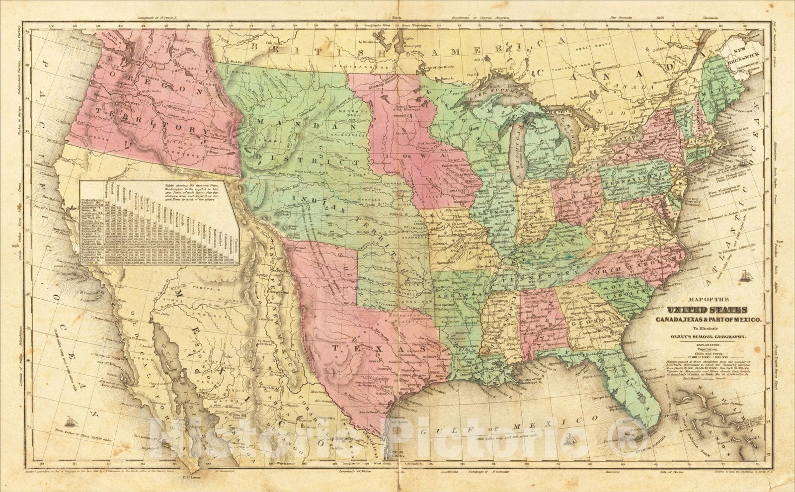 Historic Map : Map of the United States Canada, Texas and Part of Mexico, To Illustrate Olney's School Geography, 1844, Jesse Olney, Vintage Wall Art