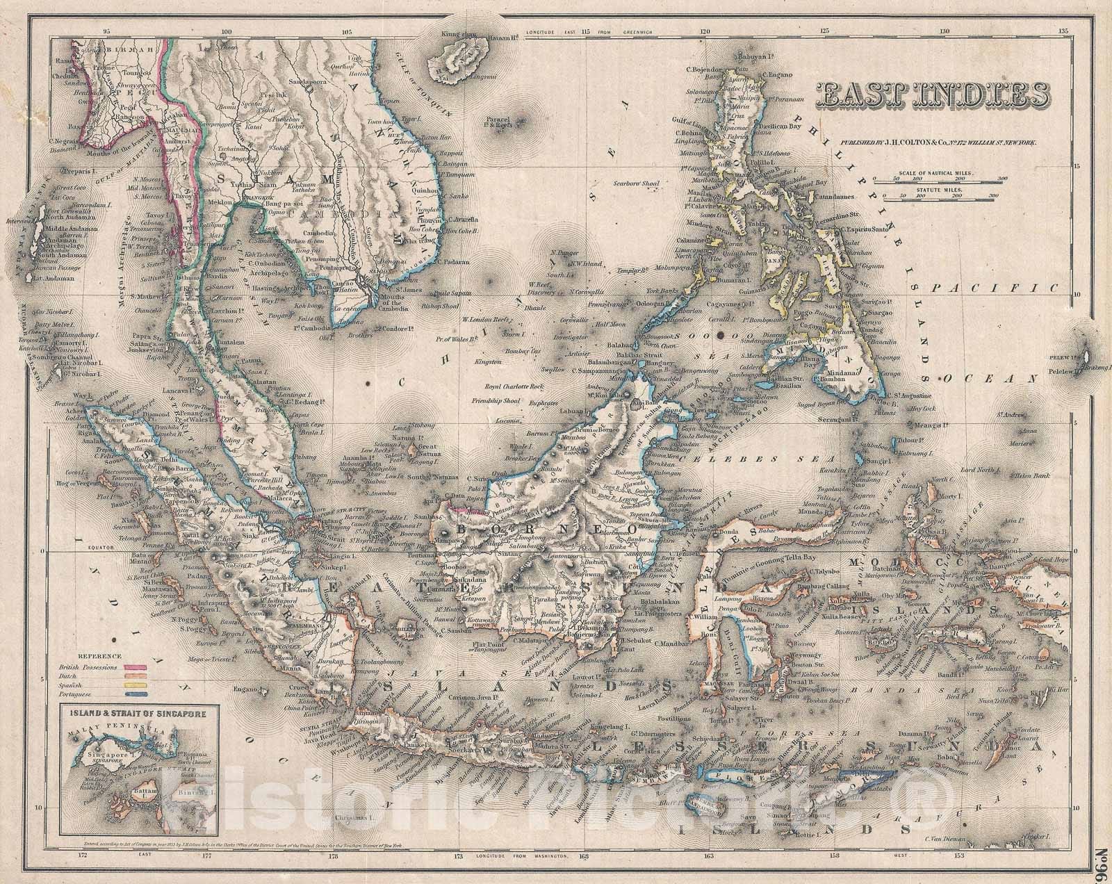 Historic Map : The East Indies "Singapore, Thailand, Borneo, Malaysia", Colton, 1857, Vintage Wall Art