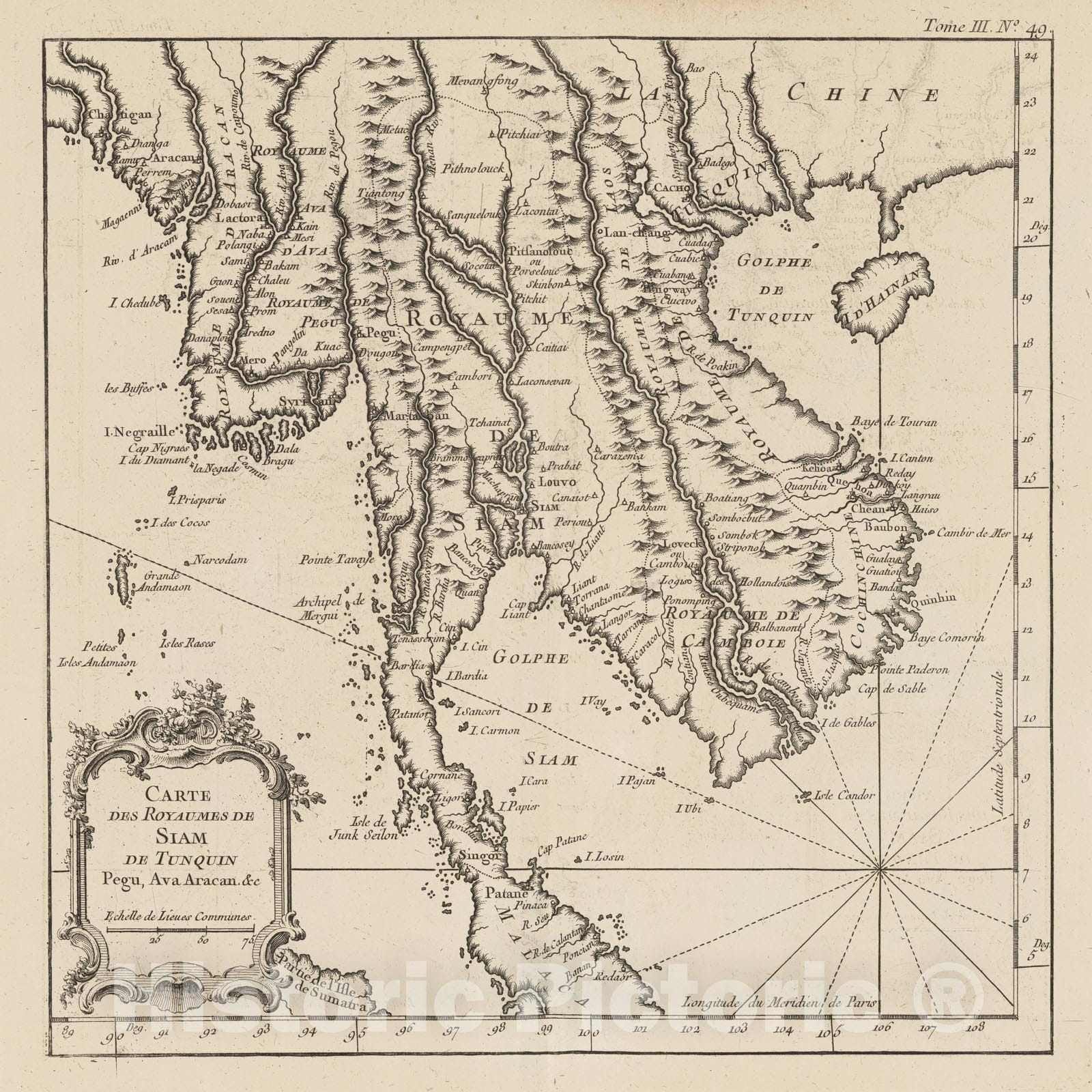 Historic Map : Thailand, Indochina 1764 Carte des royaumes de Siam, de Tunquin, Pegu, Ava Aracan, c. , Vintage Wall Art