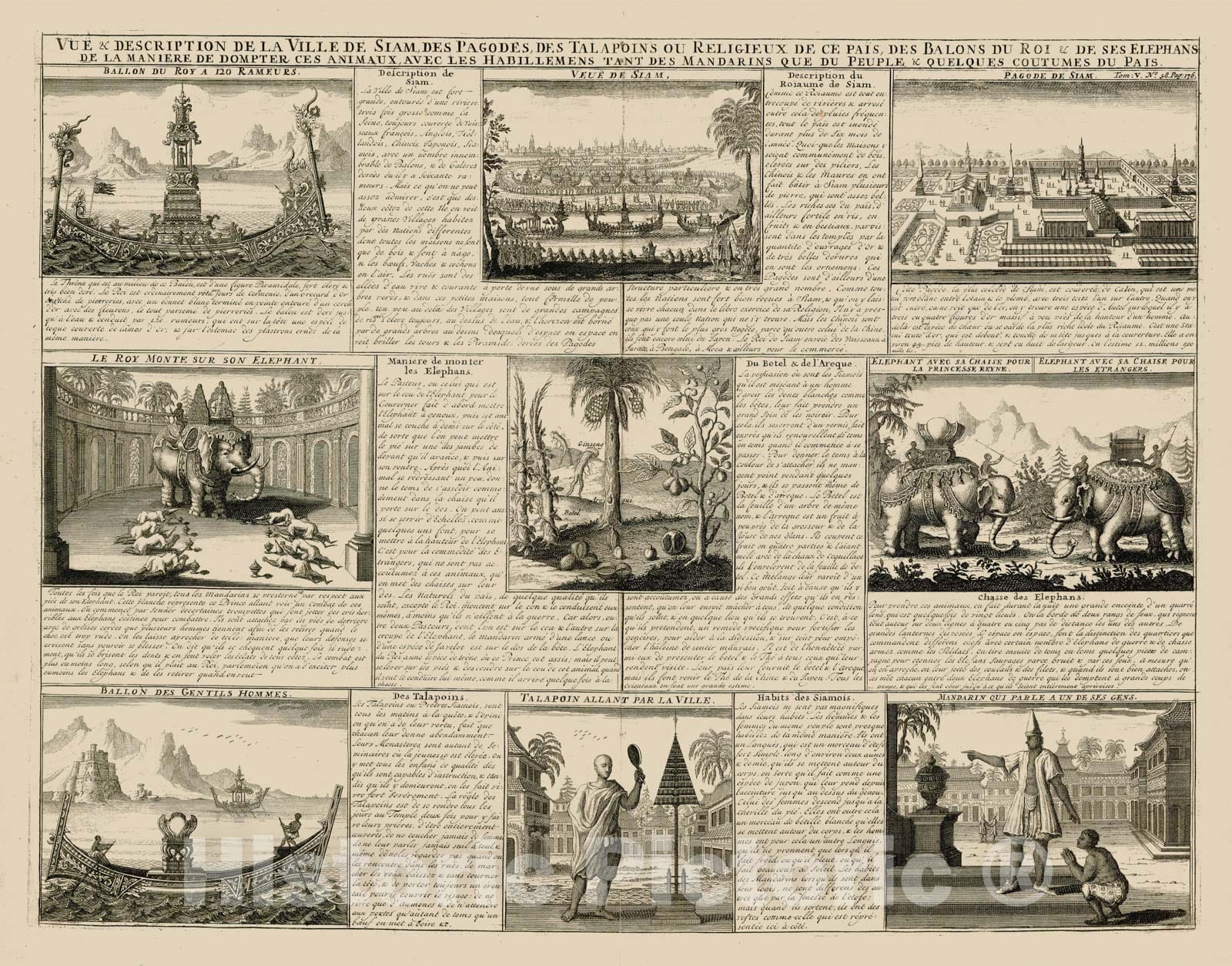 • Historic Map - Vue & description de la ville de Siam, des Pagodes, des Tal/Set of 9 indigenous Views of Thailand, from Chatelain's Atlas Historique, 1711 - Vintage Wall Art
