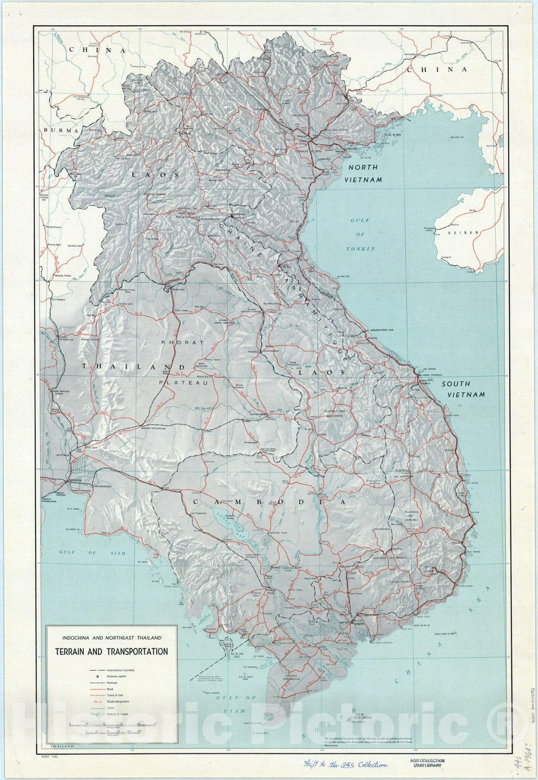 Map : Indochina 1961, Indochina and northeast Thailand, terrain and transportation, Antique Vintage Reproduction