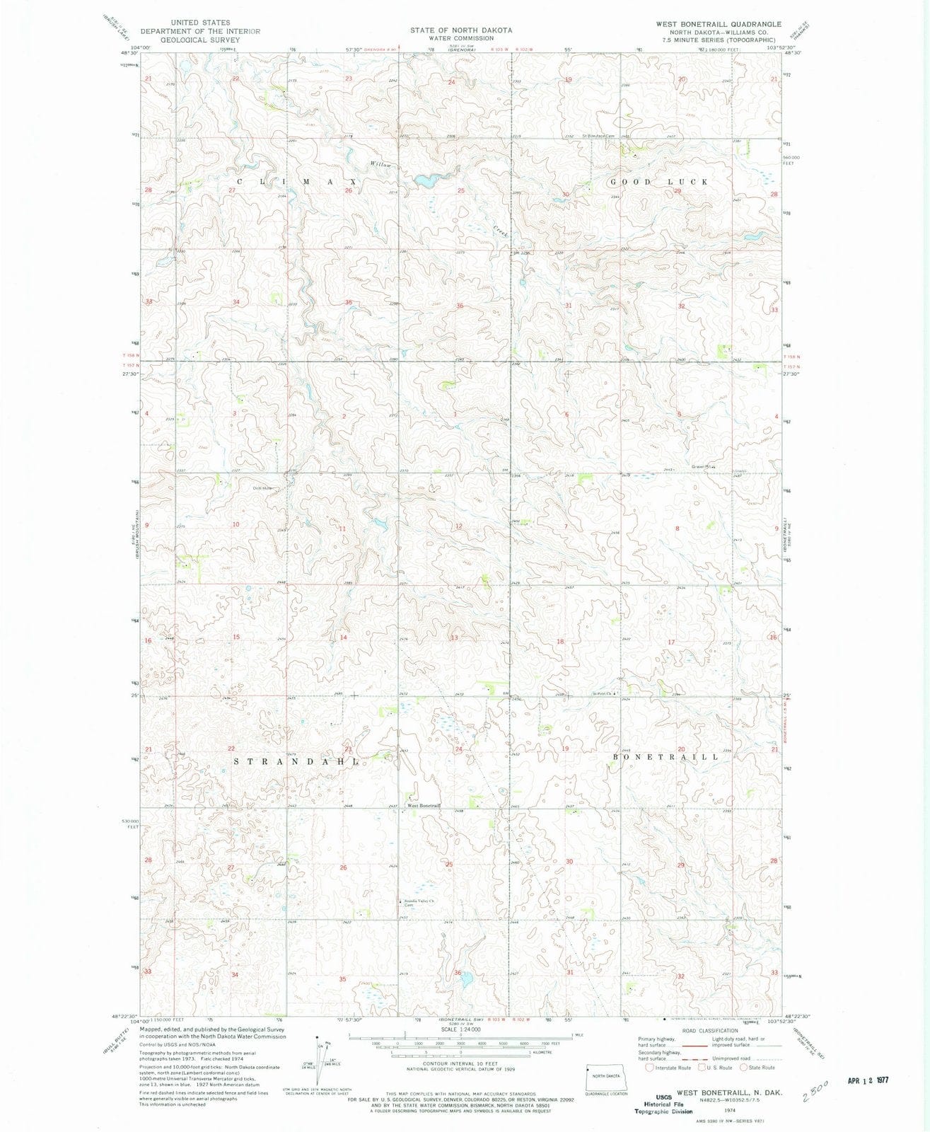 1974 West Bonetraill, ND - North Dakota - USGS Topographic Map