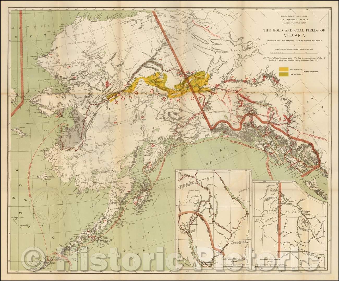 Historic Map - The Gold and Coal Fields of Alaska Together with the Principal Steamer Routes and Trails, 1898, U.S. Geological Survey - Vintage Wall Art