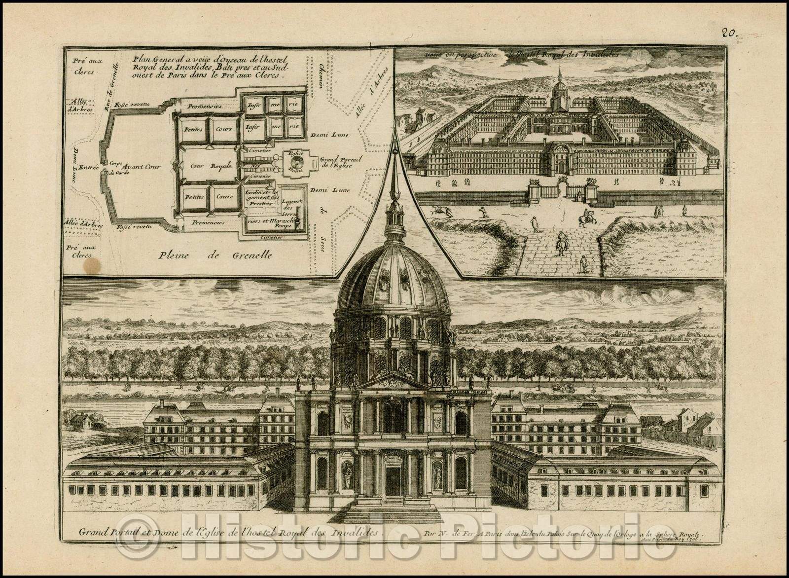 Historic Map - Grand Portrail etDome de l'Eglise de L'hostel Royal des Invalides/View and two smaller Plans showing Hostel de Invalides, 1705, Nicolas de Fer - Vintage Wall Art