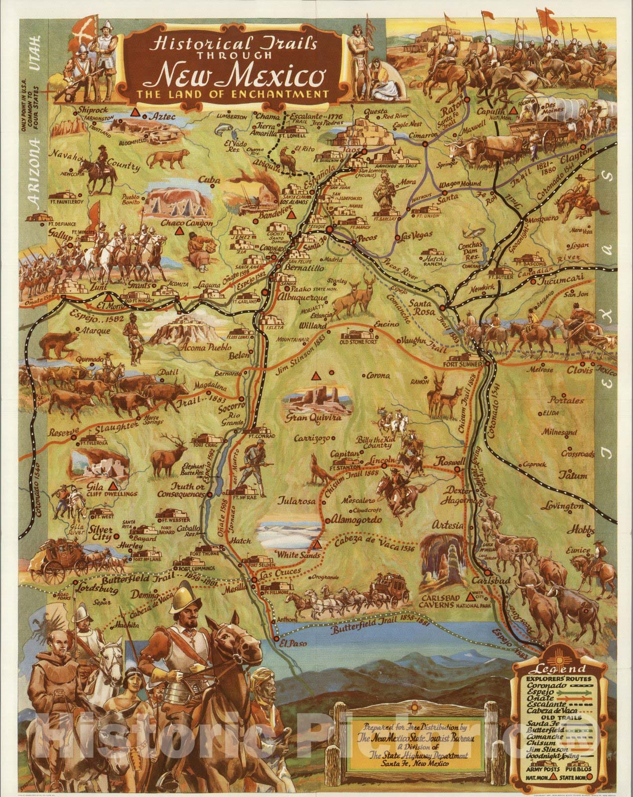 • .Historic Map : Historical Trails Through New Mexico, The Land of Enchantment 1951 - Vintage Wall Art
