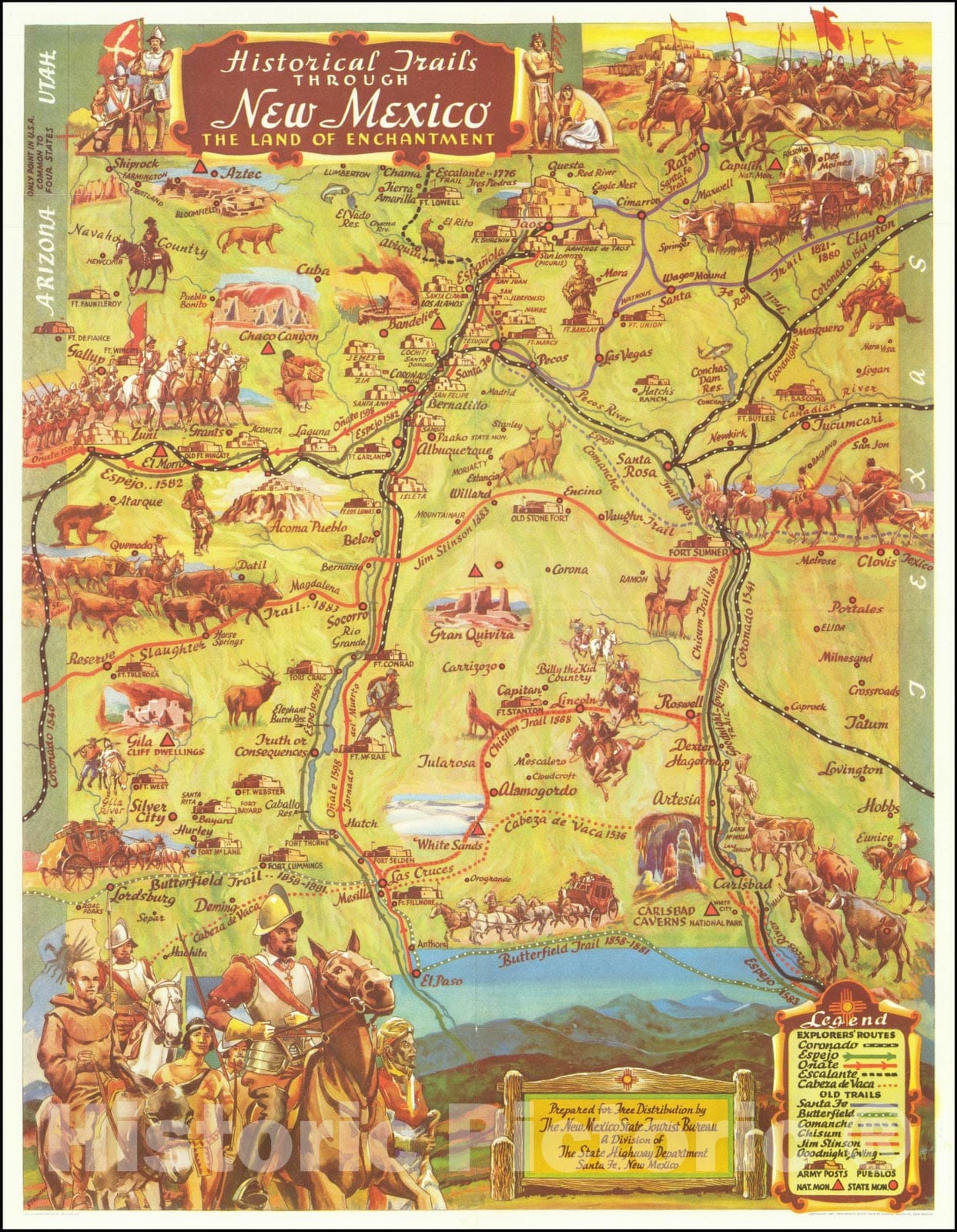 Historic Map : Historical Trails Through New Mexico The Land of Enchantment, 1940, Vintage Wall Art