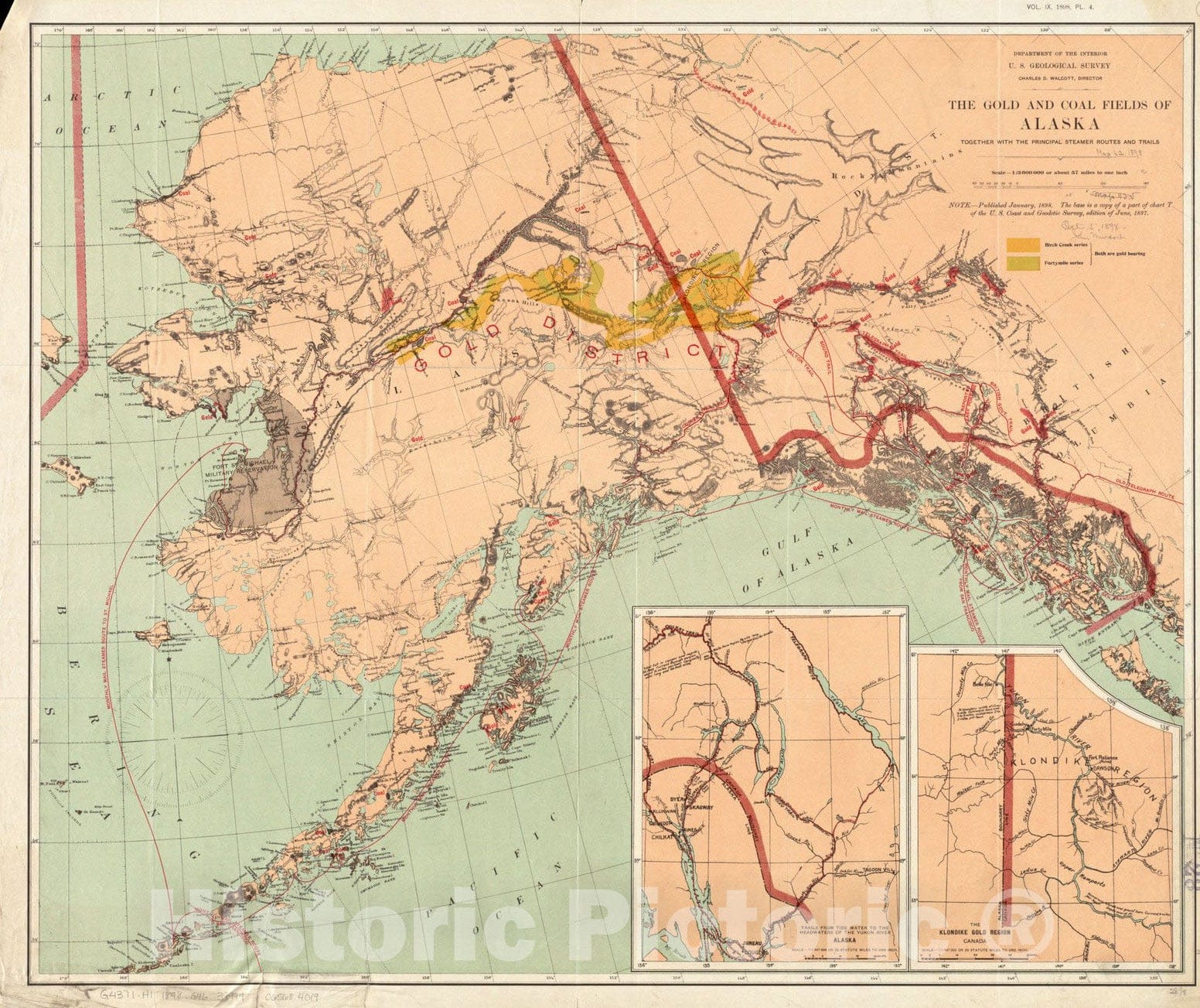 Historical Map, 1898 The Gold and Coal Fields of Alaska : Together with The Principal Steamer Routes and Trails, Vintage Wall Art