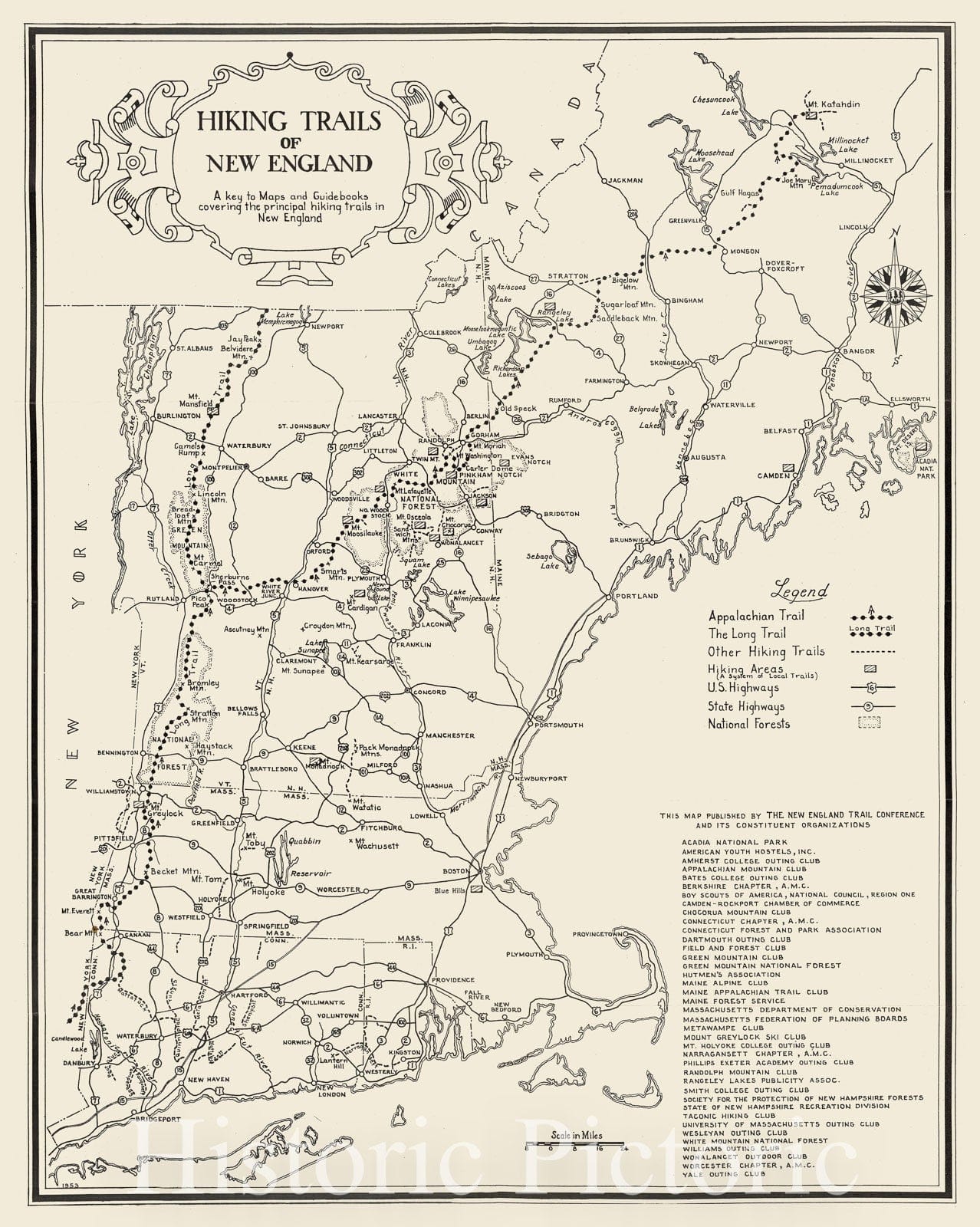 Historic Map : Hiking Trails of New England A key to Maps and Guidebooks covering the principal hiking trails in New England, 1953 , Vintage Wall Art