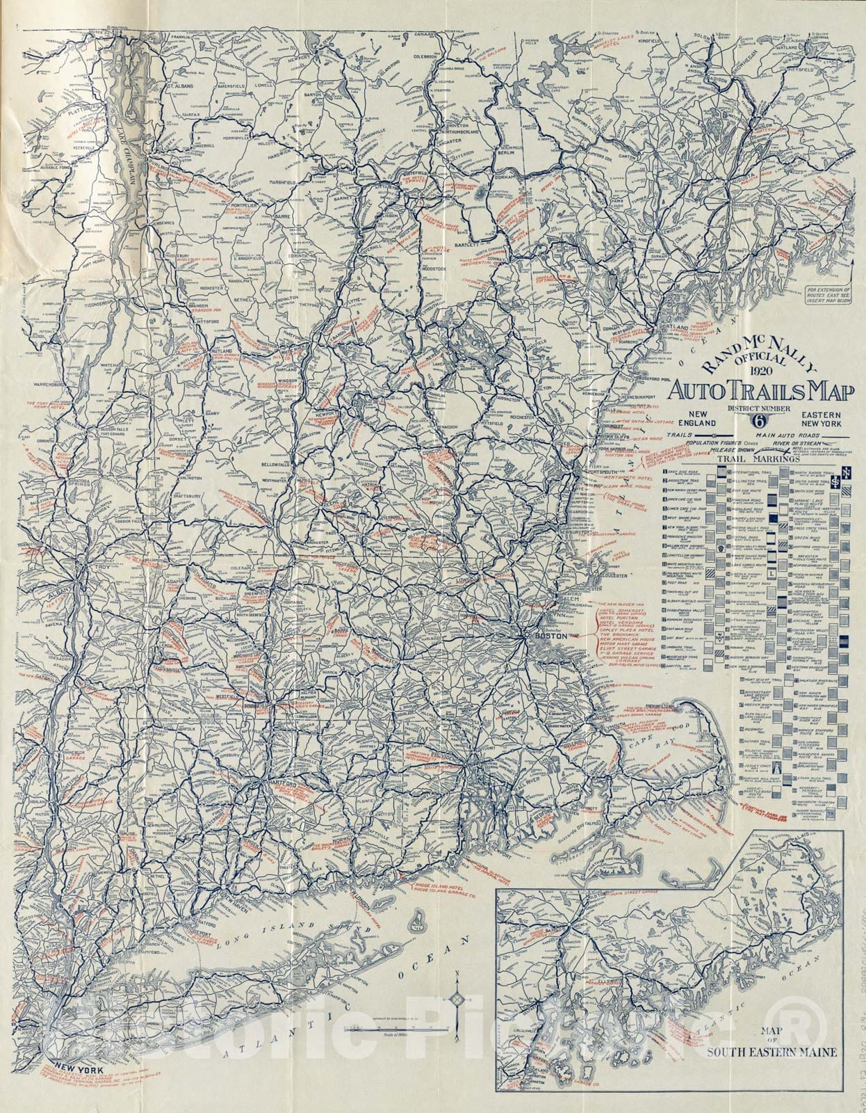 • .Historical Map, Rand McNally Official 1920 auto Trails map : District Number 6 : New England, Eastern New York, Vintage Wall Art