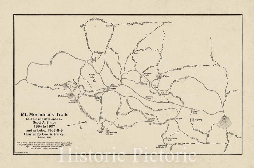 Historical Map, Mt. Monadnock Trails Laid Out and Developed by Scott A. Smith, 1894 to 1907, and as Below 1907-8-9, Vintage Wall Art