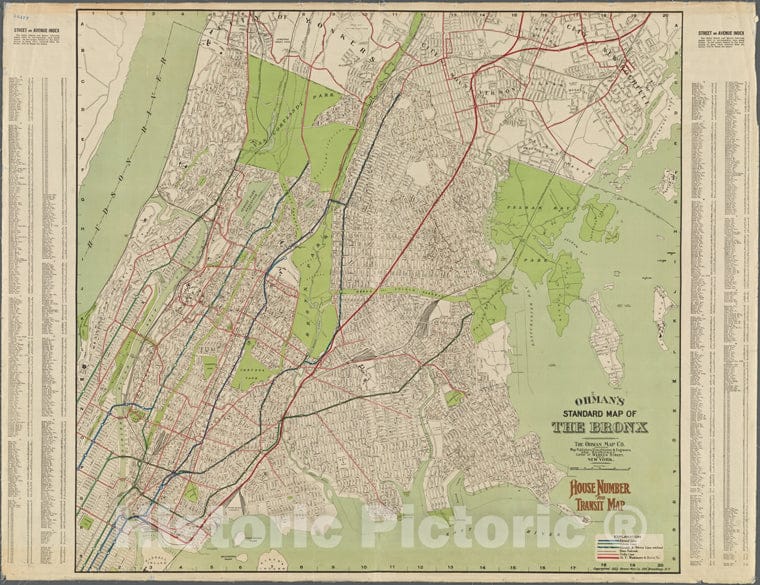 • .Historic 1922 Map - Ohman'S Standard Map Of The Bronx. House Numbers And Transit Map.Of New York City And State - Bronx - Vintage Wall Art