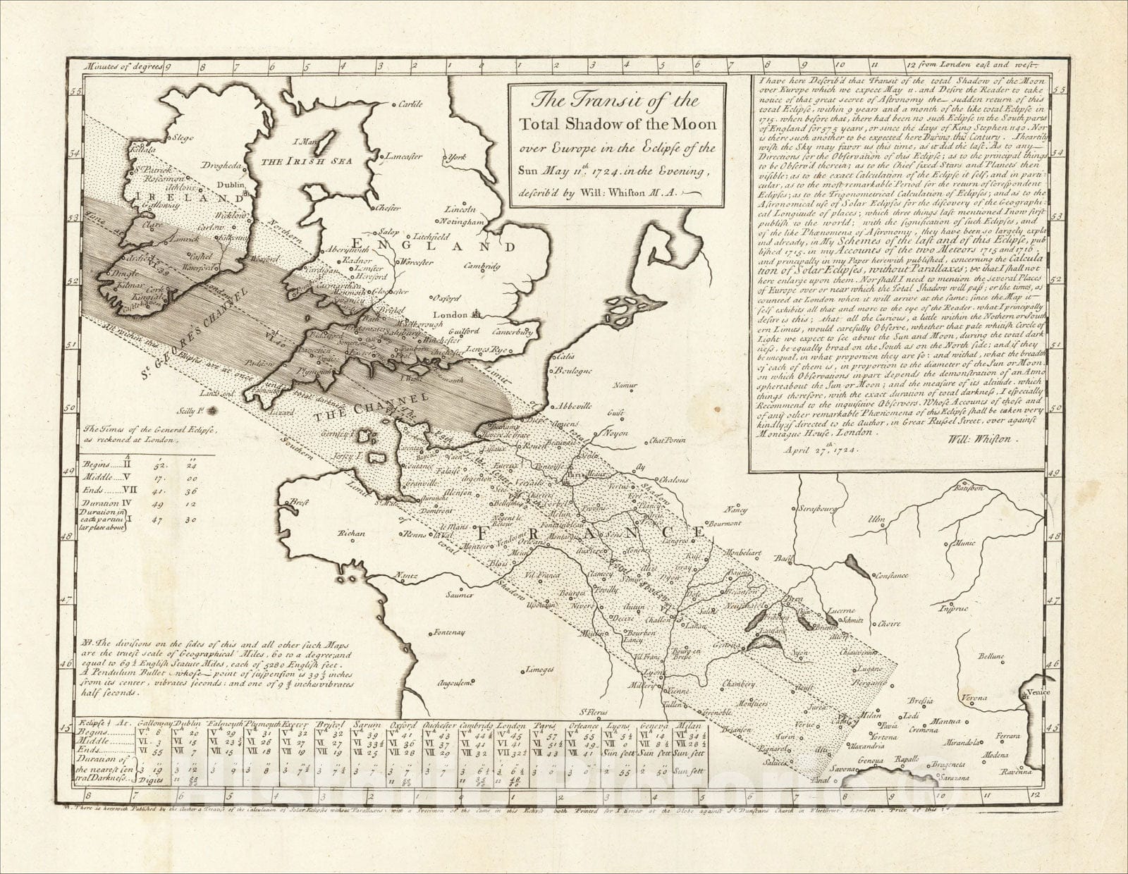 Historic Map : The Transit of the Total Shadow of the Moon over Europe in the Eclipse of the Sun May 11th, 1724, in the Evening, 1724, John Senex, Vintage Wall Art