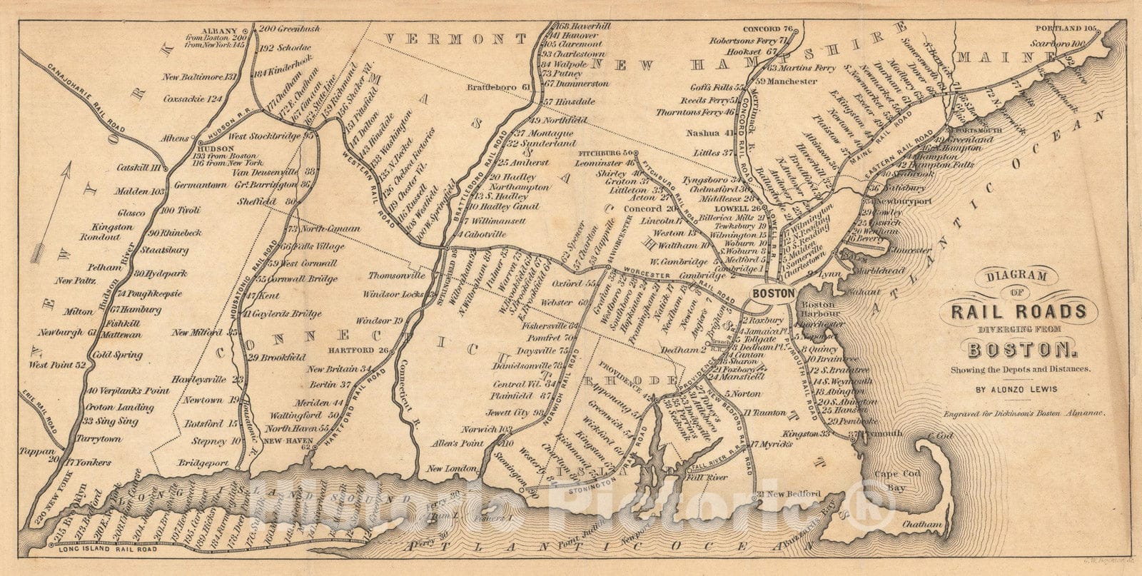 Historic Map : Boston Directory & Almanac Maps, Diagram of Rail Roads Diverging from Boston 1846 Transit Railroad Catography , Vintage Wall Art