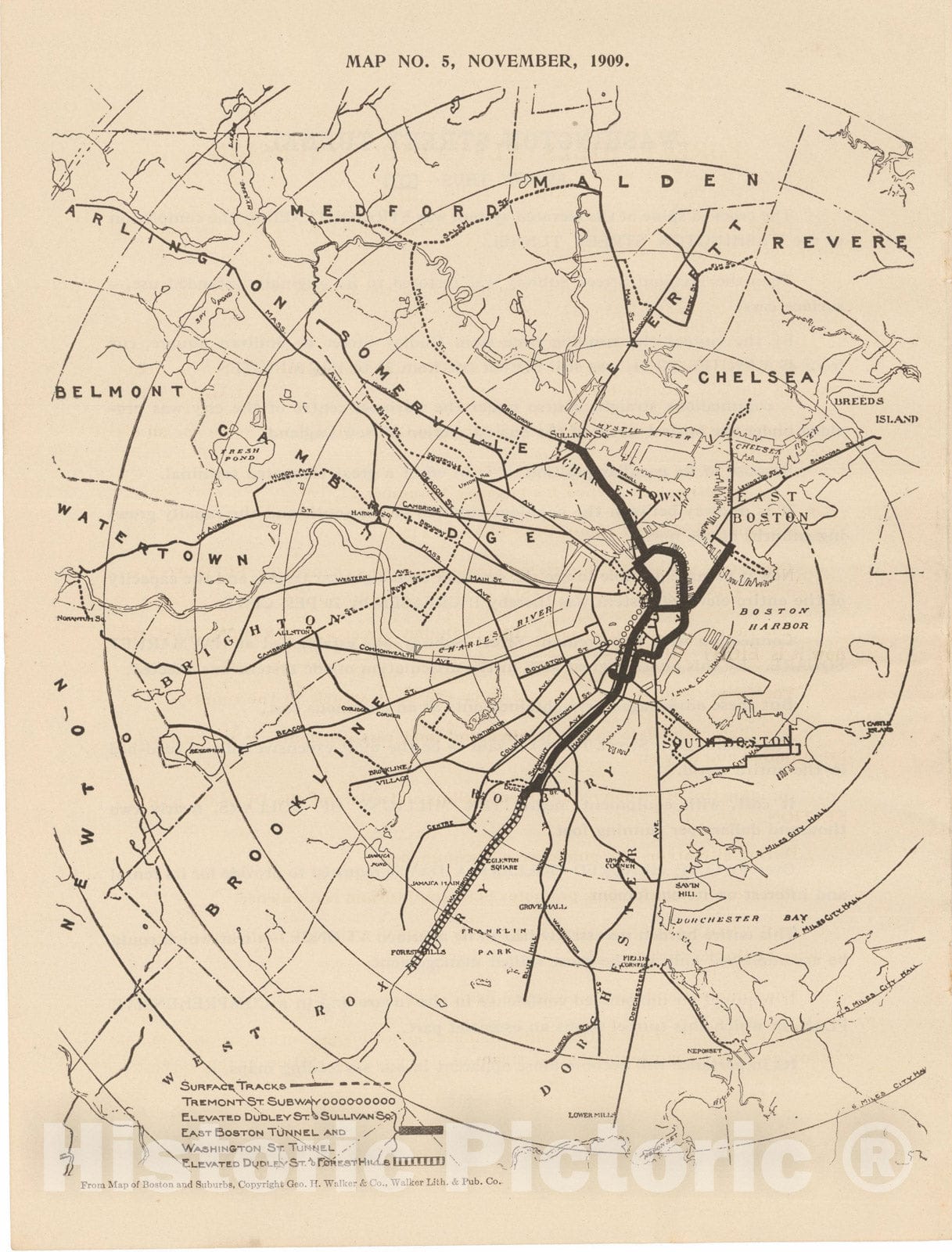 Historic Map : Boston Elevated Railway Co. Informational Maps, Map 5: System November 1909; published 1910 Transit Railroad Catography , Vintage Wall Art