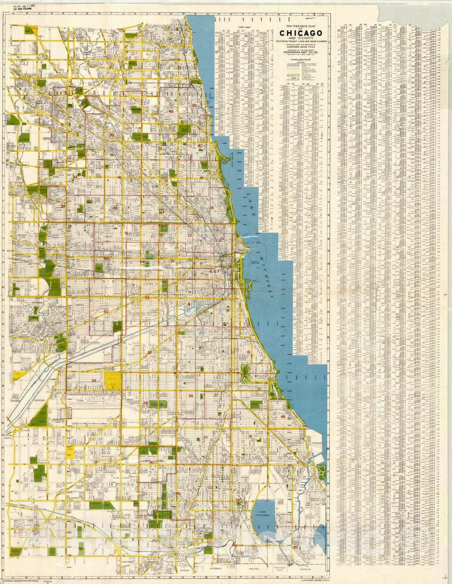 The Premier map of Chicago and vicinity : featuring transit lines and house numbers / Geographia Map Co., Inc., produced under the direction of Alexander Gross