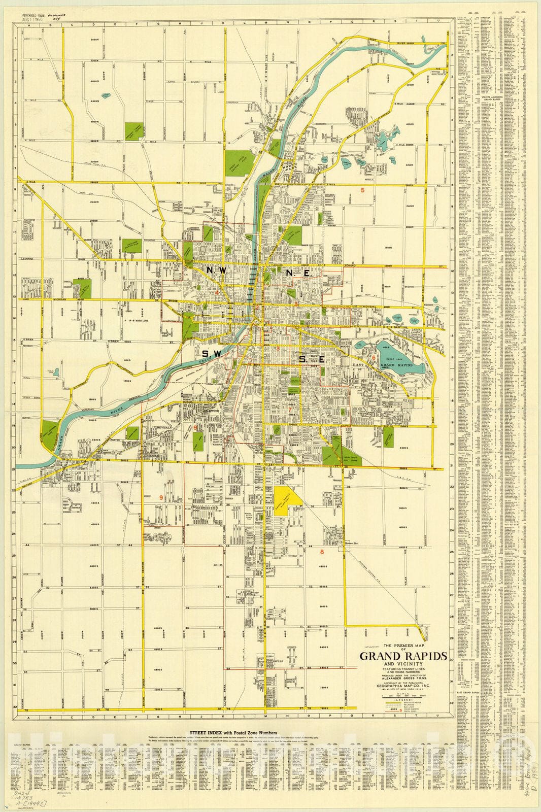 The Premier map of Grand Rapids and vicinity : featuring transit lines and house numbers / produced under the direction of Alexander Gross ; copyright by the publishers Geographia Map Co., Inc