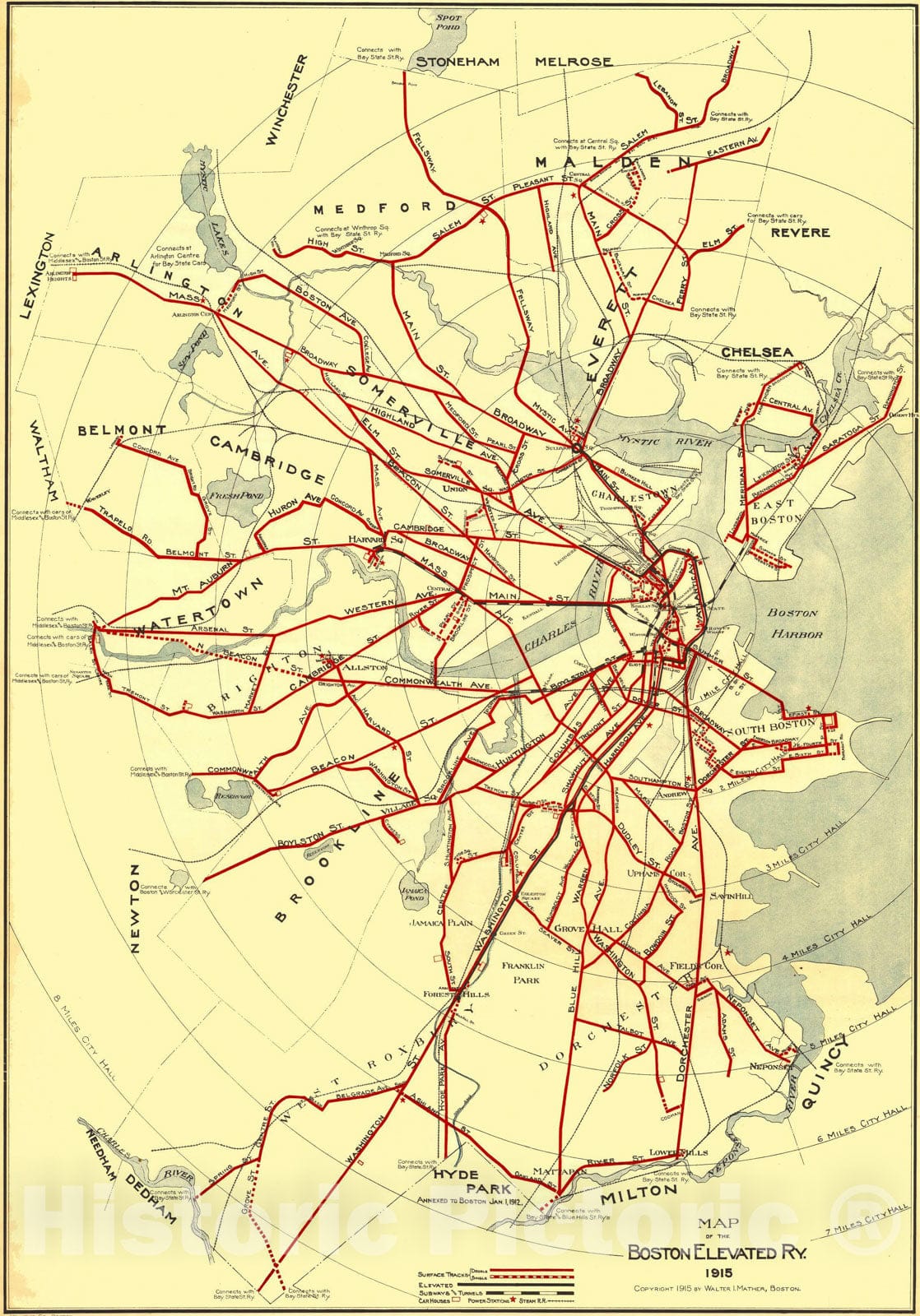 Historic Map : Greater Boston Transit Maps, Boston Elevated Railway 1915 Railroad Catography , Vintage Wall Art