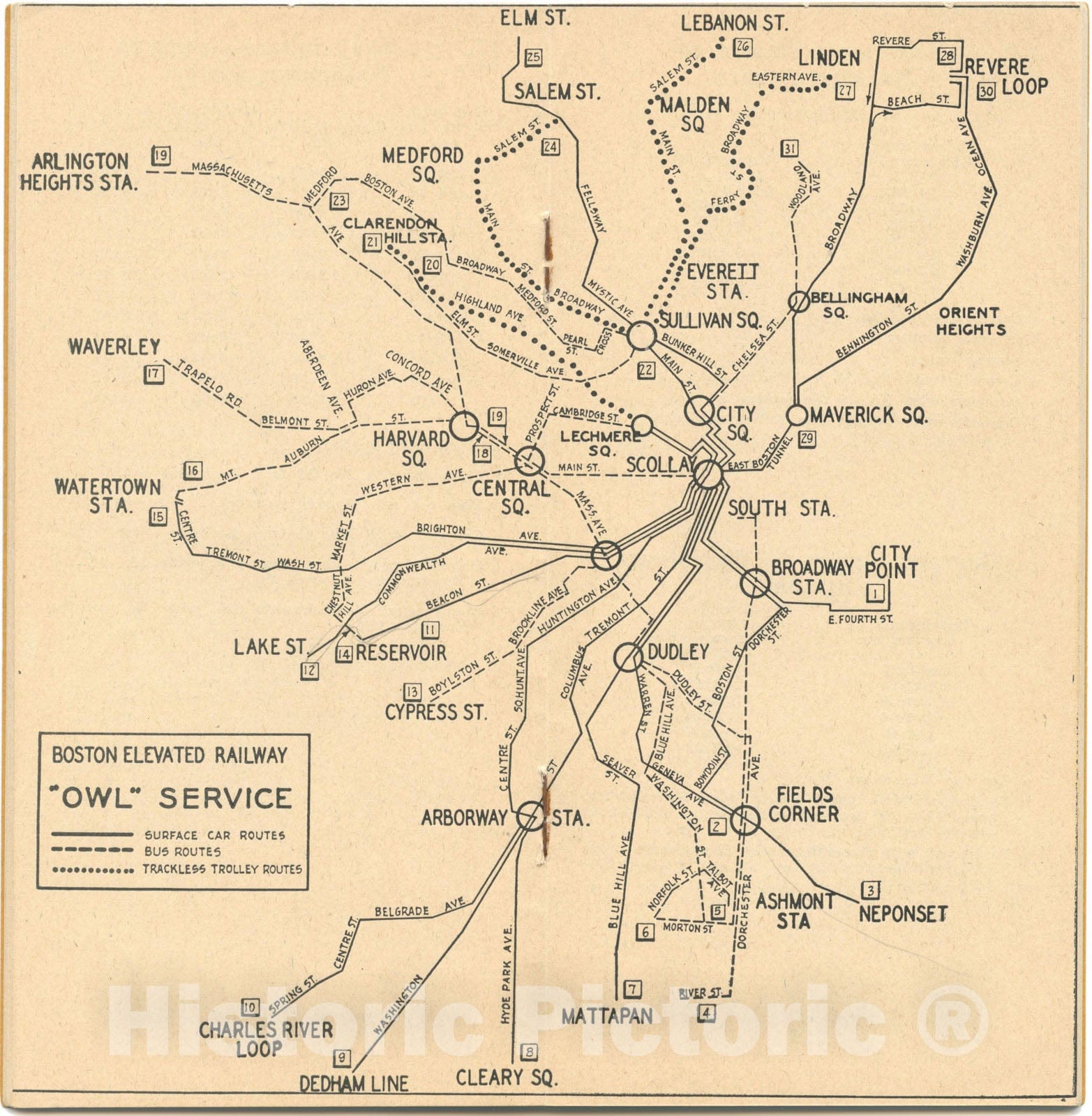 Historic Map : Greater Boston Transit Maps, Boston Elevated Railway Owl Service Map 1947 Railroad Catography , Vintage Wall Art