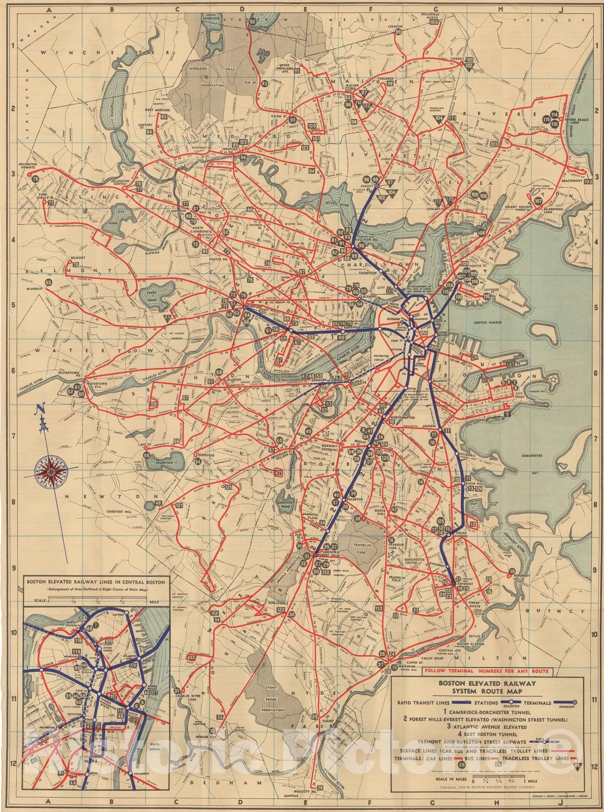 Historic Map : Greater Boston Transit Maps, Boston Elevated Railway System Route Map No. 3 1938 Railroad Catography , Vintage Wall Art