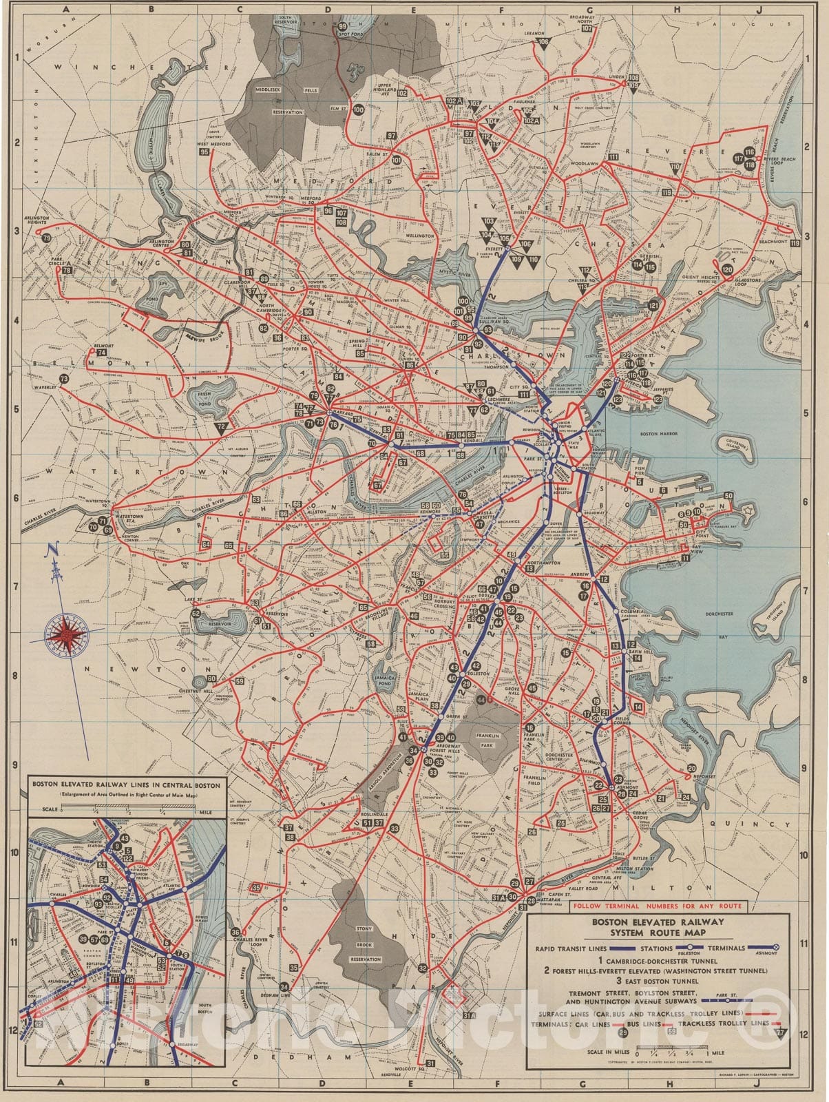Historic Map : Greater Boston Transit Maps, Boston Elevated Railway System Route Map No. 6 1943 Railroad Catography , Vintage Wall Art