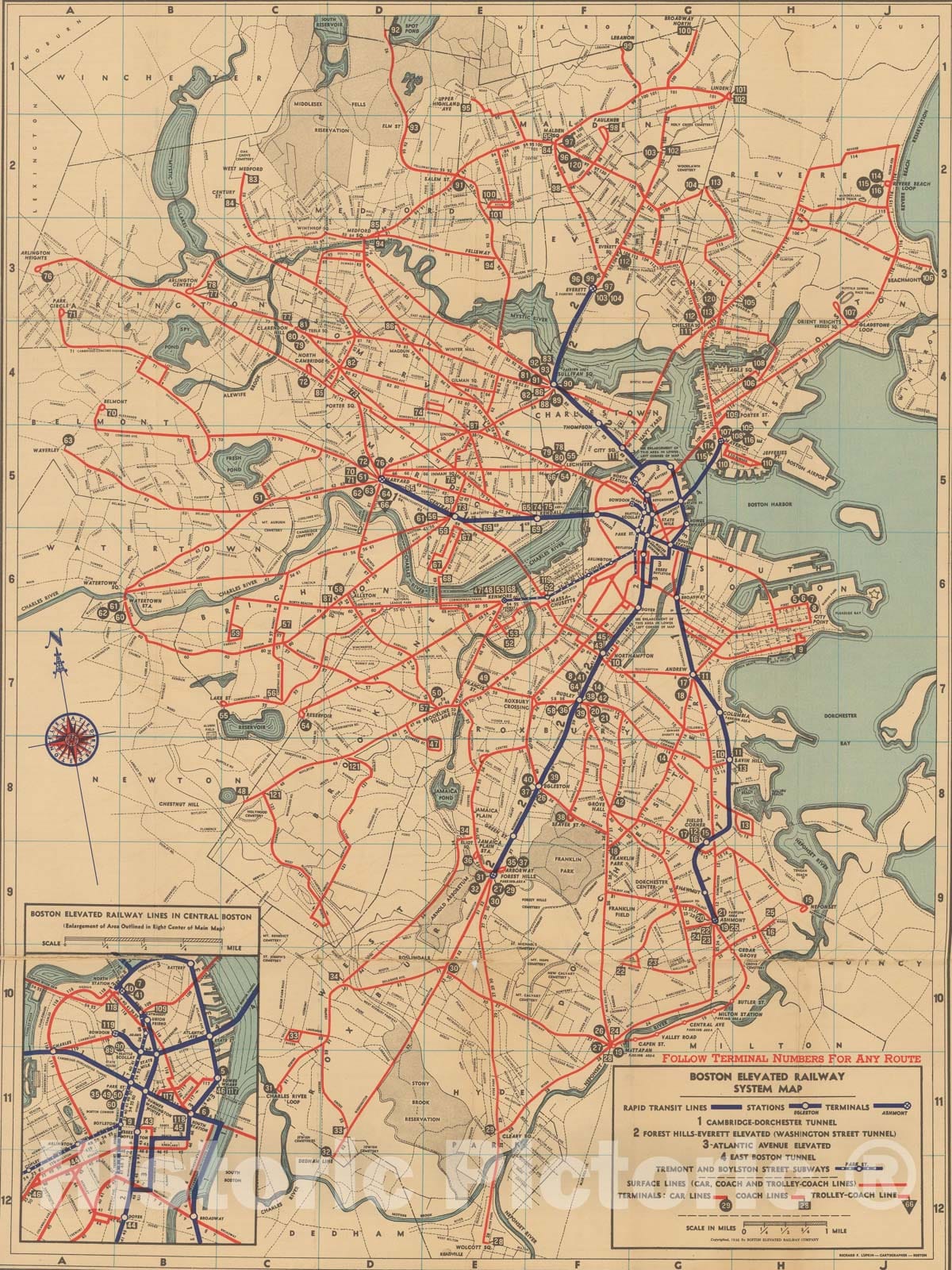 Historic Map : Greater Boston Transit Maps, Boston Elevated Railway System Route Map No. 1 1936 Railroad Catography , Vintage Wall Art