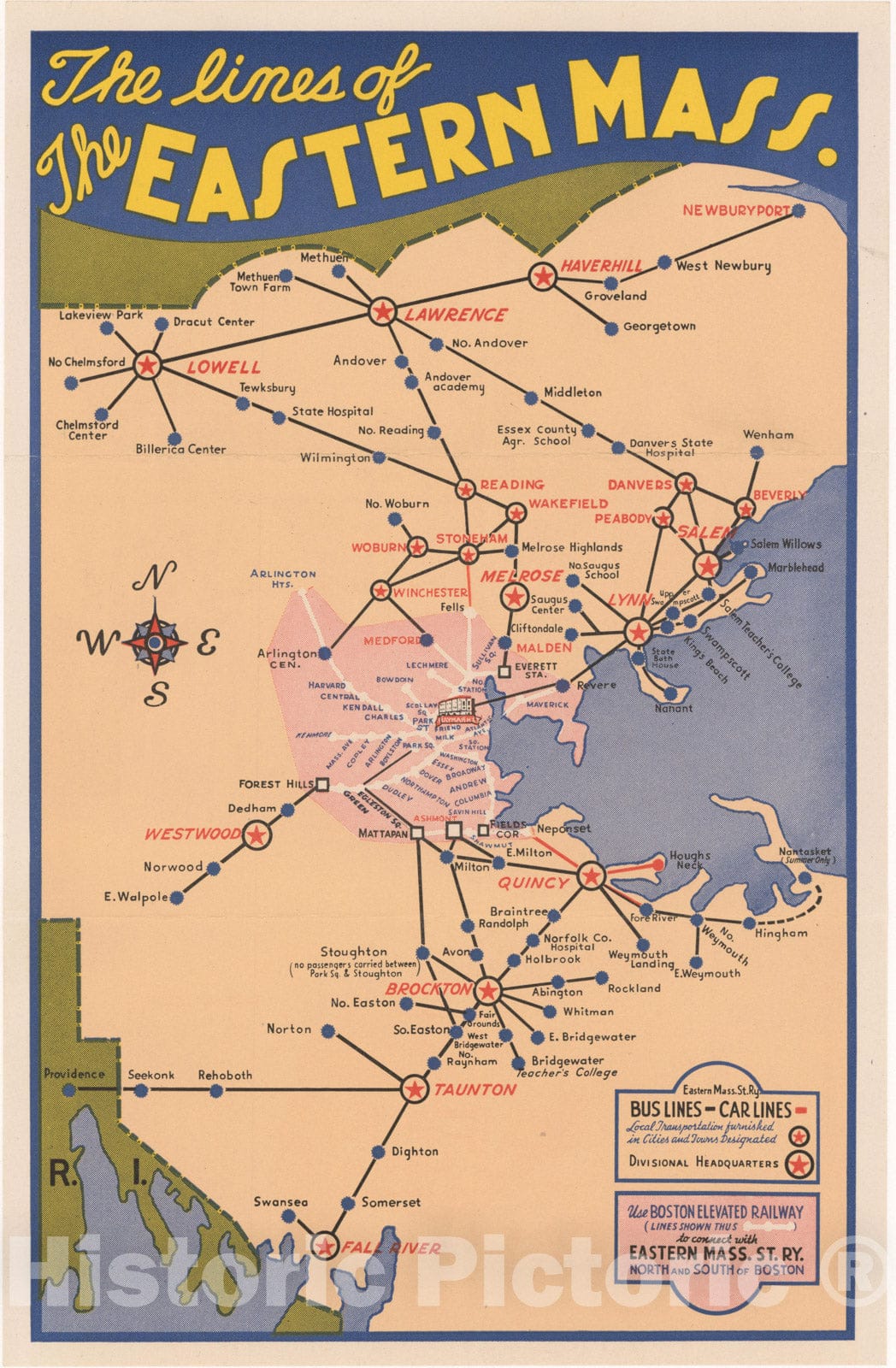 Historic Map : Greater Boston Transit Maps, The Lines of the Eastern Mass. Street Railway 1945 Railroad Catography , Vintage Wall Art