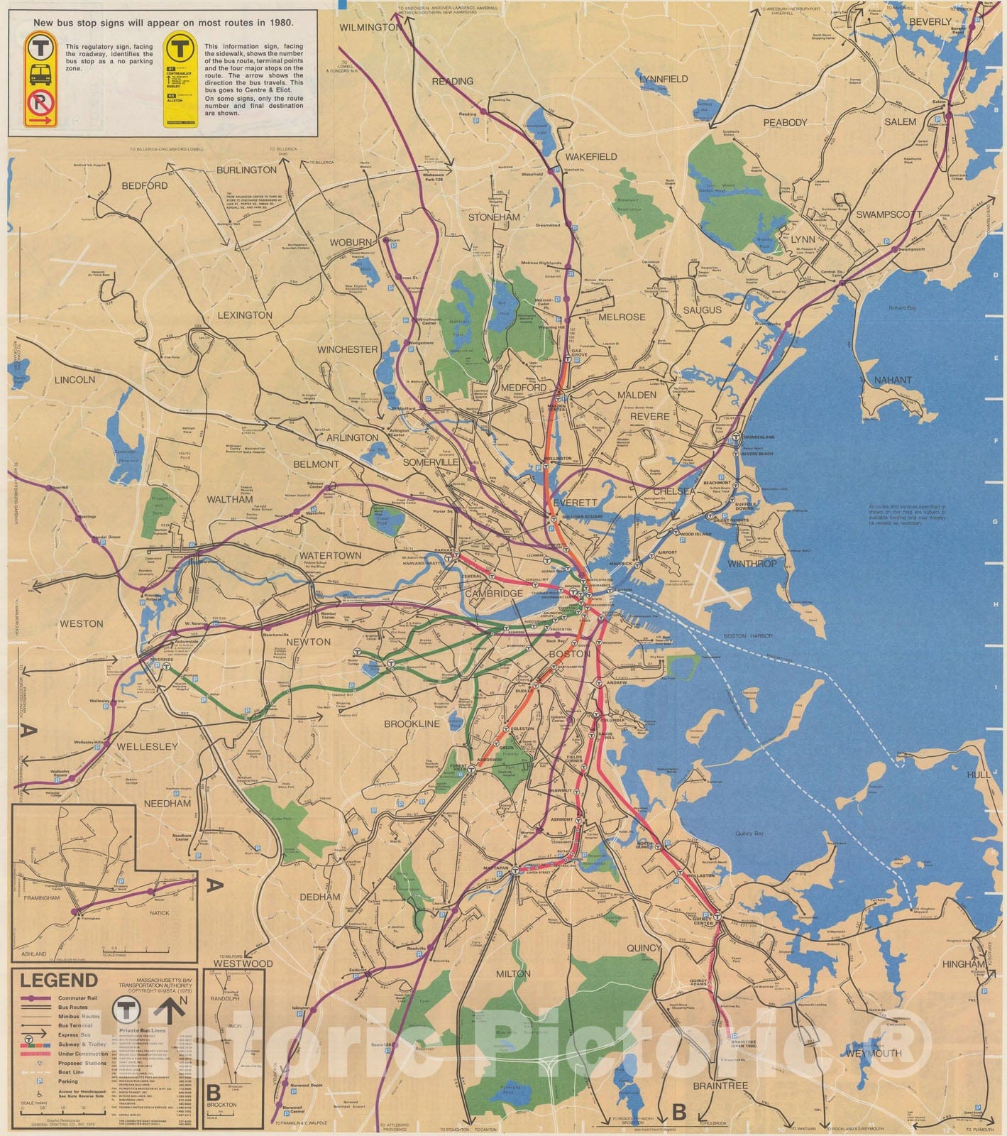 Historic Map : Greater Boston Transit Maps, MBTA System Map 1980 Railroad Catography , v2, Vintage Wall Art