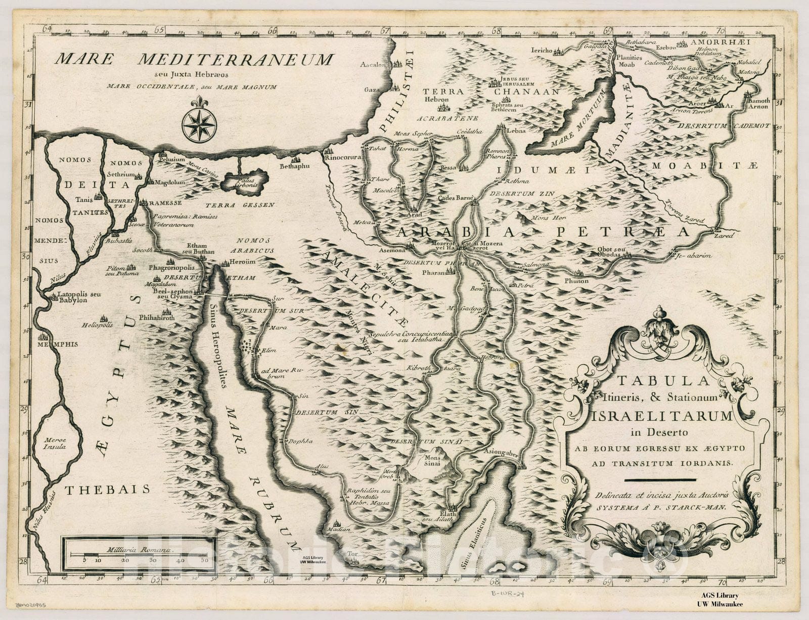 Tabula Itineris & Stationum Israelitarum in Deserto ab eorum egressu ex Aegypto ad transitum Iordanis / delineata et incisa juxta Auctoris systema a P. Starck-man