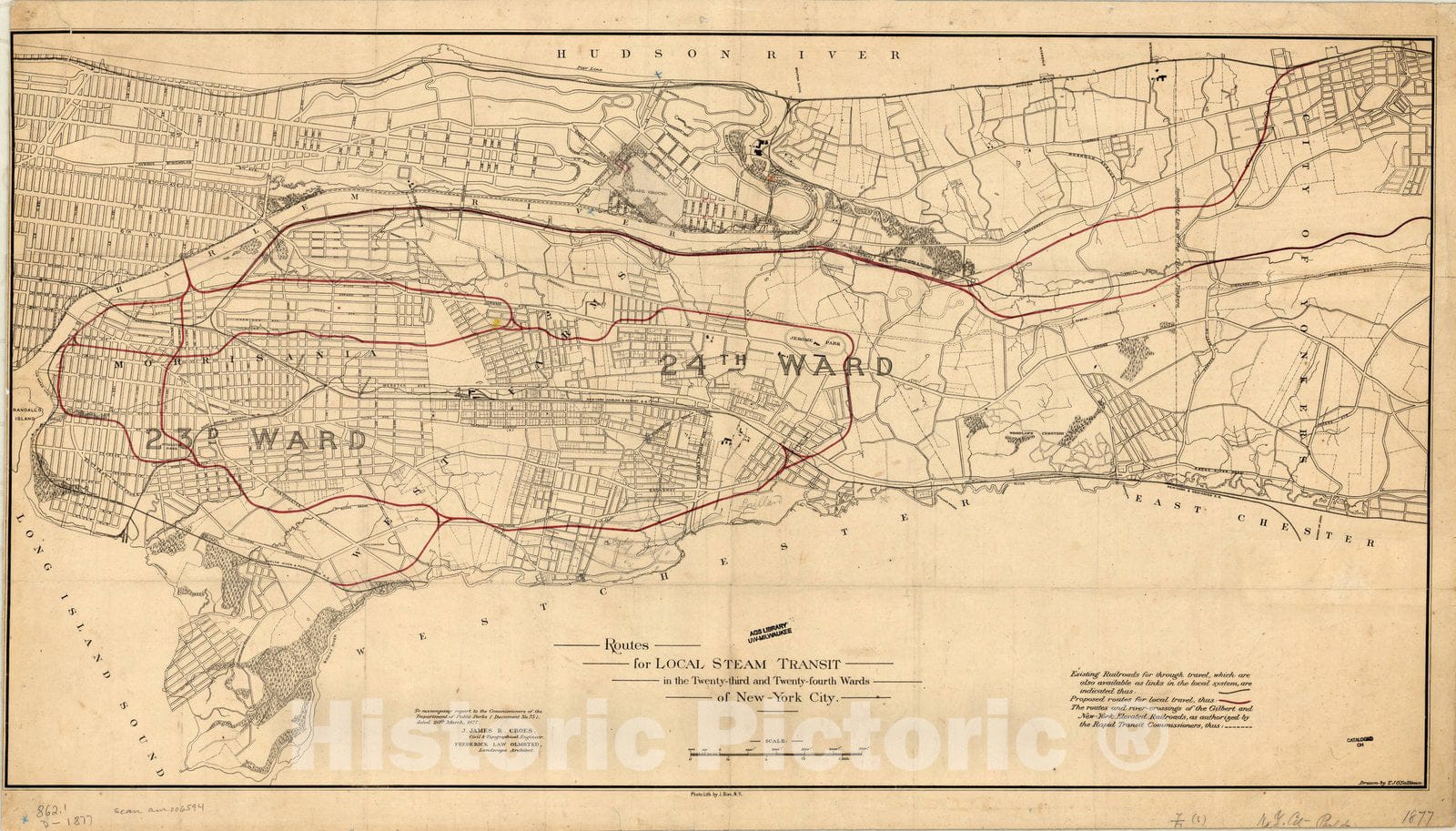 Map : New York City, New York 1877, Routes for local steam transit in the Twenty-third and Twenty-forth Wards of New York City , Antique Vintage Reproduction