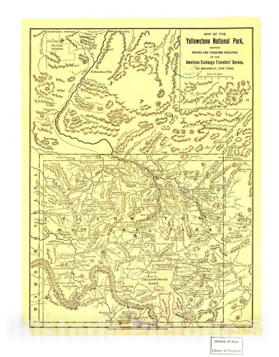 Historic 1883 Map - Map of The Yellowstone National Park, Showing Routes and Ticketing Facilities of The American Exchange Travelers' Bureau.