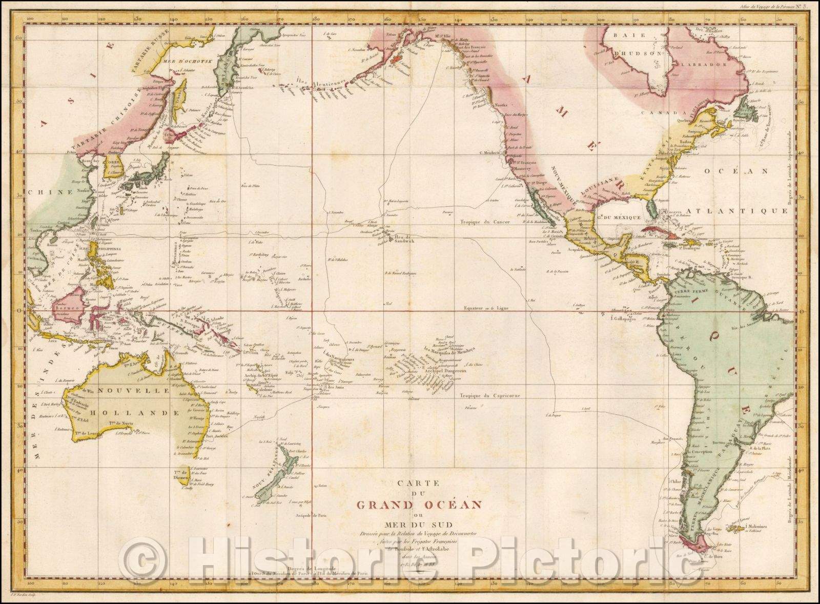 • .Historic Map - Carte Du Grand Ocean ou Mer du Sud Dressee pour la Relation du Voyage de D :: The Grand Ocean or South Sea Discoveries pitched for the travel, 1797 - Vintage Wall Art