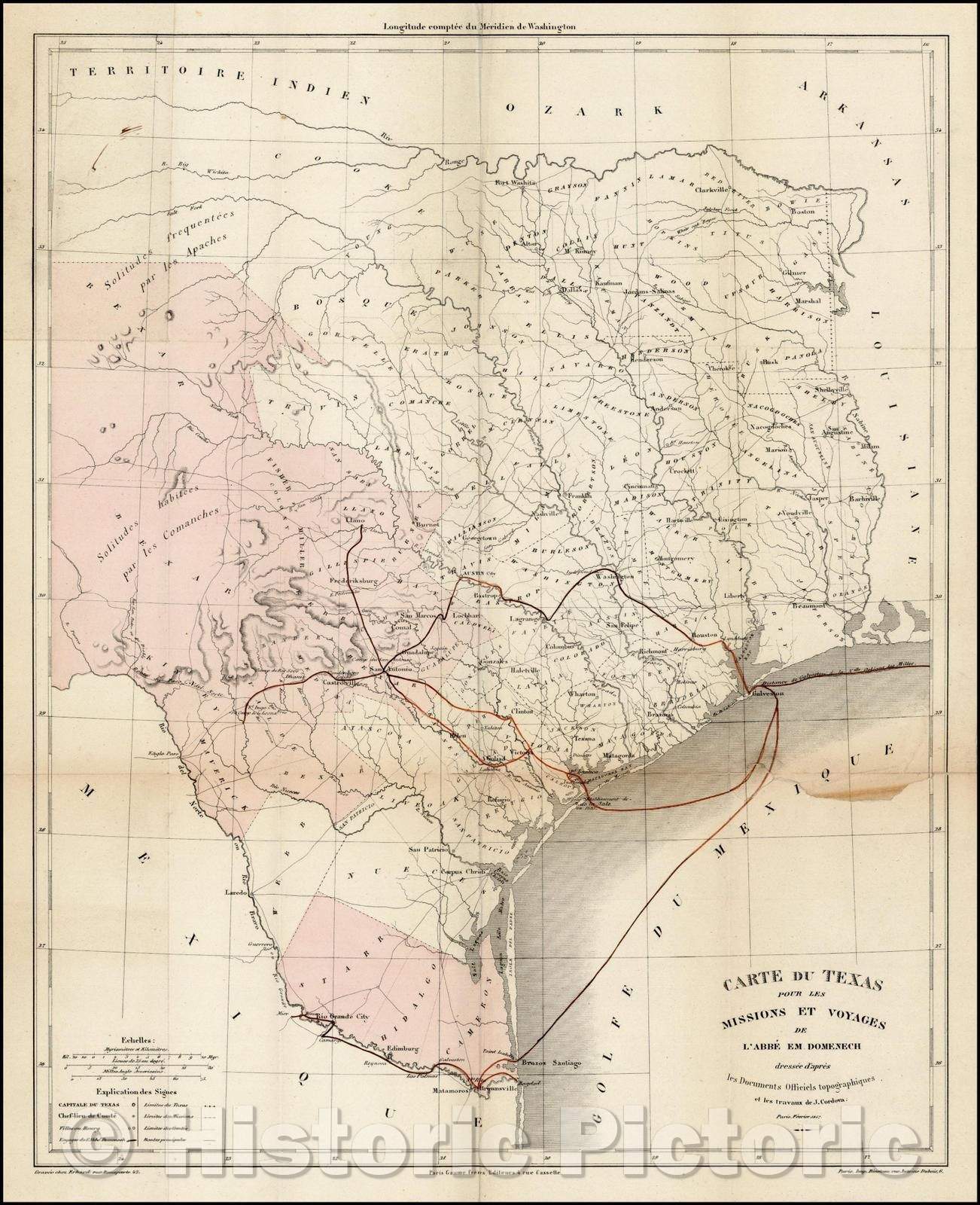 Historic Map - Carte Du Texas Pour Les Missions Et Voyages Due L'Abbe E.M. Domench dressee d :: Texas, journal of the travels of Abbe Emmanuel Domenech, 1857 - Vintage Wall Art