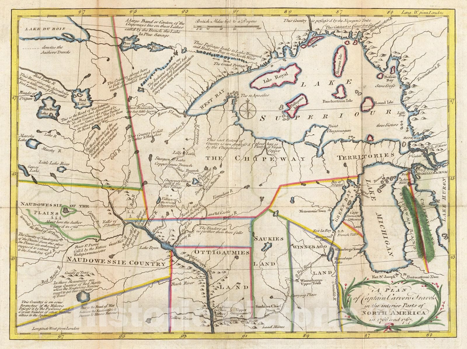 Historic Map : Exploration Book - 1781 Plan of Captain Carvers Travels in the interior Parts of North America. - Vintage Wall Art